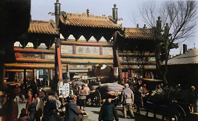 这个木牌坊群叫四牌楼,中间匾额写着永泰街,梁枋交错,彩画还透着油亮,马车从底下穿,叫卖声从柱子后头绕出来,奶奶笑说,出门遇见熟人,先不打招呼,得抬头看看匾,图个喜气。