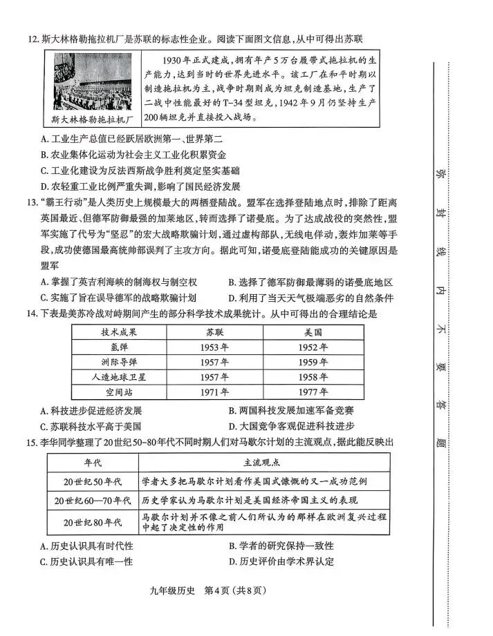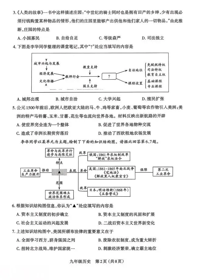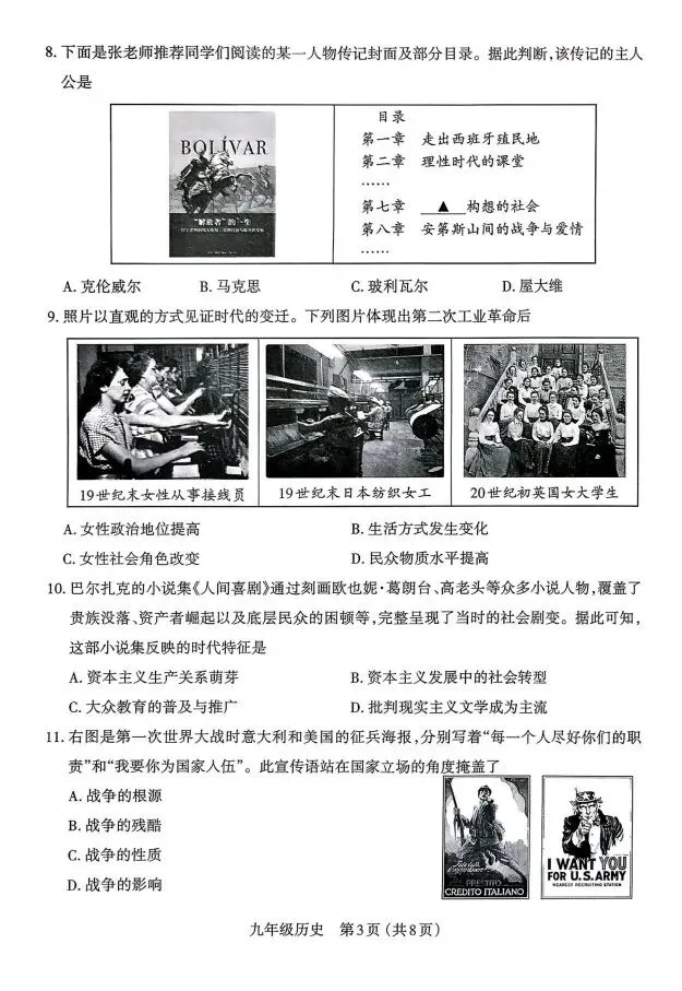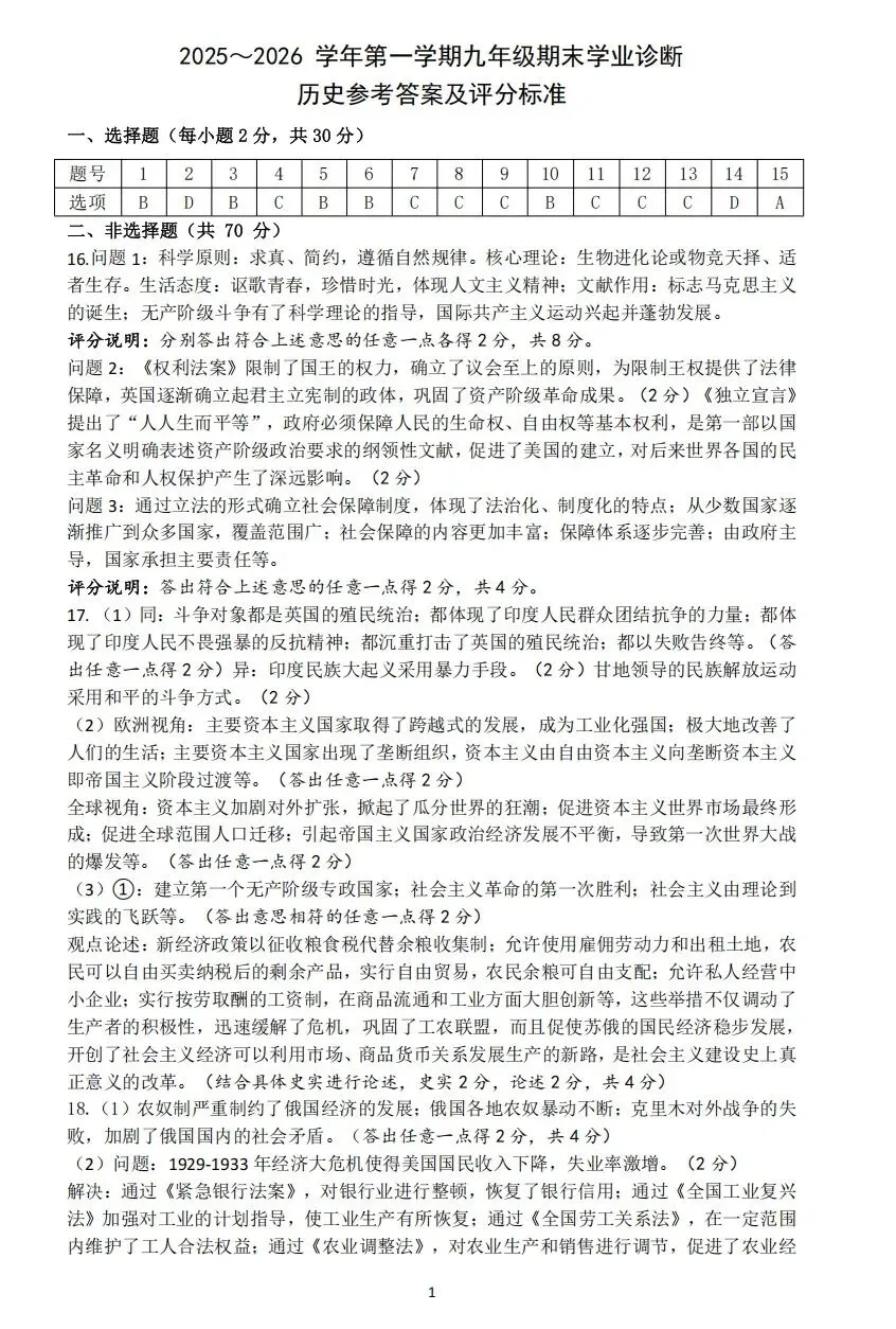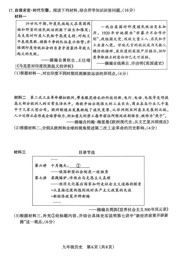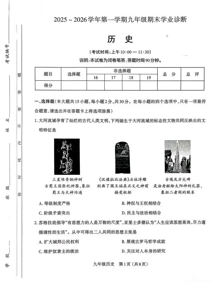 太原市2025-2026九年级历史第一学期期末学业诊断