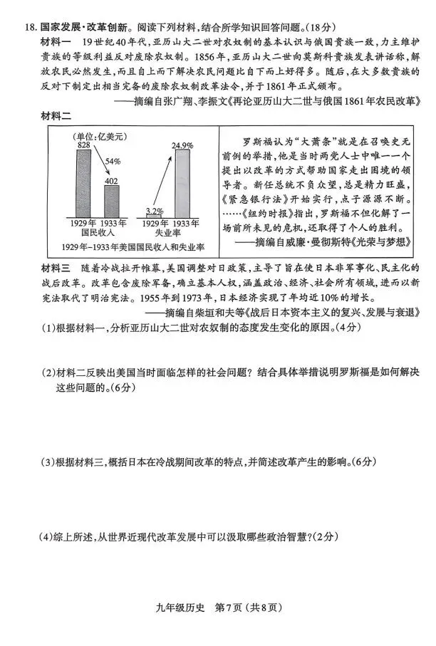 (3)特点:美国主导:非军事化与民主化相结合;改革领域广泛;新宪法取代明治宪法。(答出任意一点得2分)影响:日本成为资本主义世界仅次于美国的第二经济大国;推动日本政治民主化的进程:提升了日本的国际地位等。(答出任意一点得2分,共4分)(4)顺应时代潮流进行改革;领导者改革创新的精神:立足国情,适时调整政策等。评分说明:答出符合上述意思的任意一点得2分。