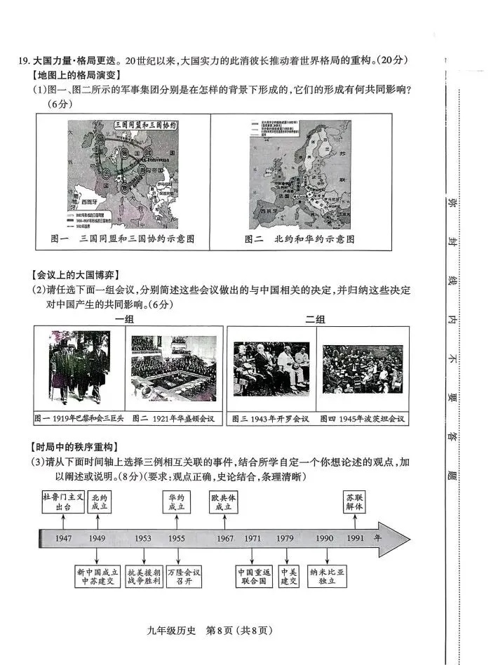 19.(1)背景:图一:第二次工业革命后,帝国主义国家之间政治、经济发展不平衡,后起的国家要求重新分割世界和划分势力范围,矛盾不断激化,以英国和德国为首分别形成三国协约和三国同盟,两大军事集团展开疯狂扩军备战。(2分)图二:第二次世界大战后,美国出台冷战政策,把欧洲看作全球战略的重点和遏制苏联扩张的第一线,为遏制苏联为首的社会主义阵营,在军事上成立了北大西洋公约组织;为了对抗北约,苏联等国成立华沙条约组织,美苏双方相互敌对,进而发展为两大集团的全面冷战对峙。(2分)