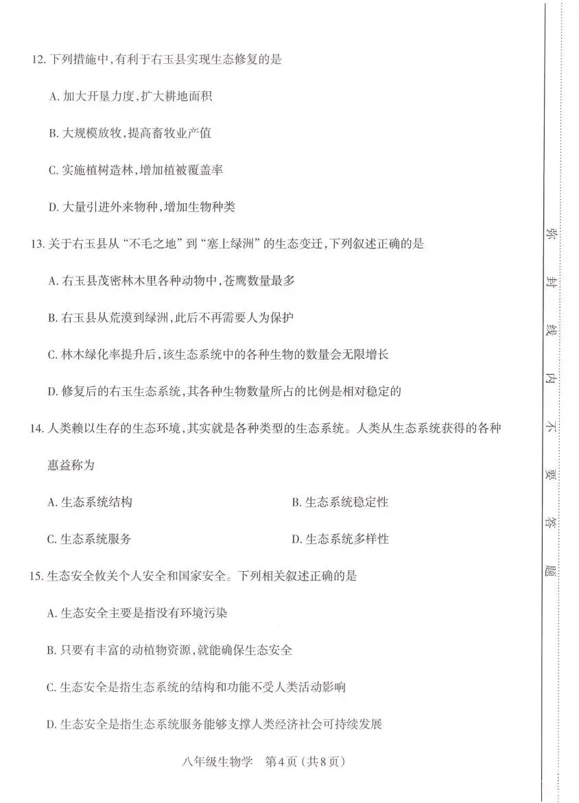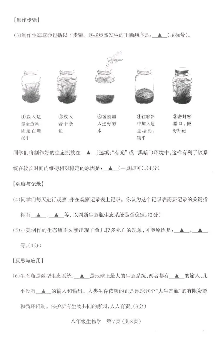 (3)④③①②⑤有光为瓶中的生产者提供光照,使其能够进行光合作用;为生态瓶输入能量(一点即可,其他合理亦可)(2分)