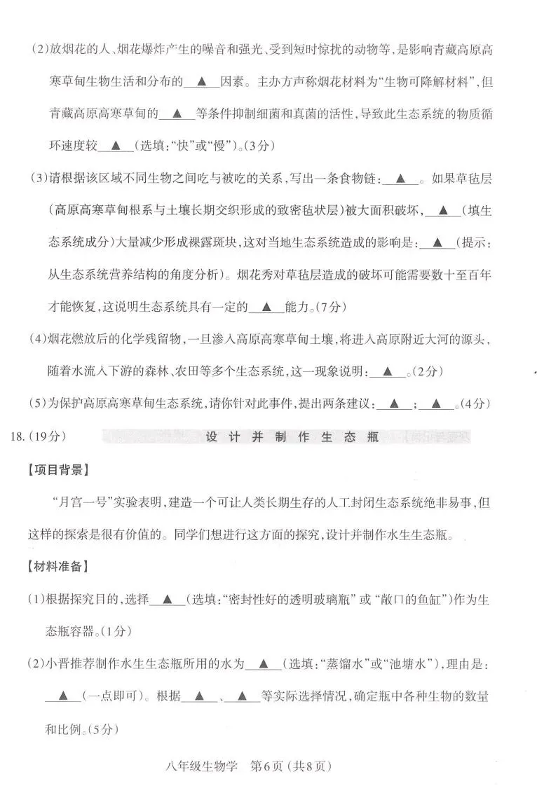 (5)生态瓶内鱼的数量过多;生态瓶内植物的数量不足:光照过强导致水温过高(两点即可,其他合理亦可)(每点2分)