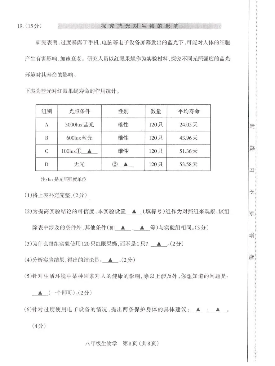 (4)在一定的蓝光光照强度范围内,不同光照强度的蓝光环境对红眼果蝇寿命有影响(或"在一定的蓝光光照强度范围内,随着蓝光光照强度的增加,红眼果蝇寿命缩短")(2分)