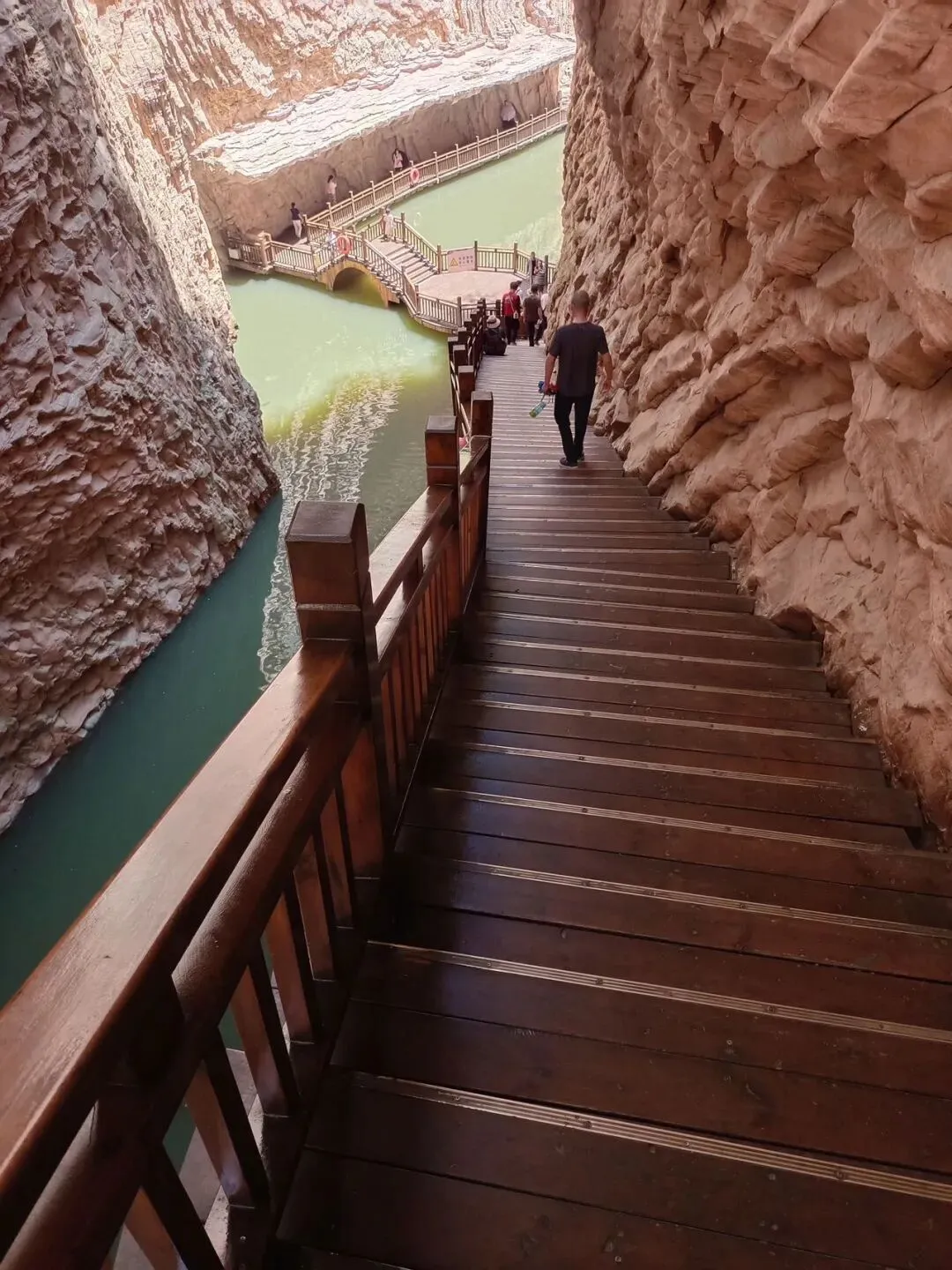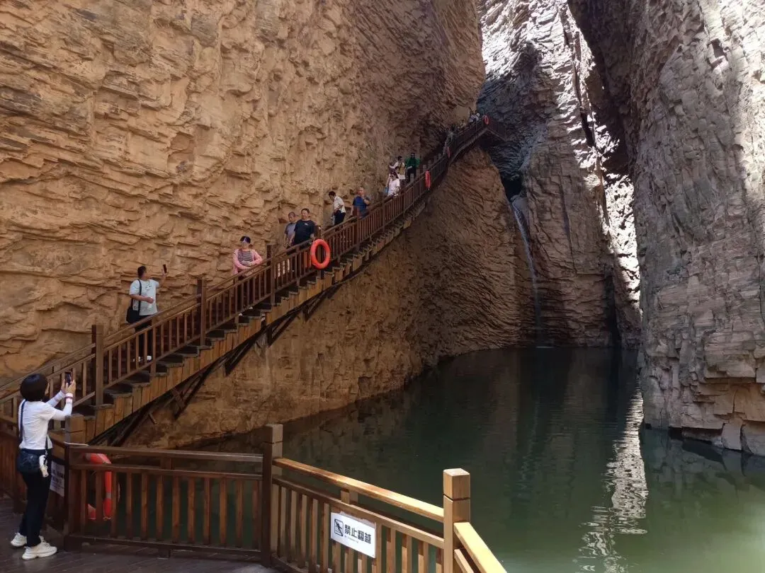 除了深厚的红色文化,黄崖洞的自然景观也独具特色。它地处太行山脉东麓,呈现出典型的嶂石岩地貌特征。红色石英砂岩经差异风化形成的赤壁丹崖绵延约5公里,相对高差达300-500米,崖壁垂直度普遍超过85度。区域内的瓮圪廊峡谷长约300米,宽仅1-3米,两侧崖壁高达百米,顶部呈穹窿状合围,形成“仰望天如线,俯视水如银”的独特空间体验。还有一线天等特殊微地貌单元,以及龙门夹瀑布等自然景观,让人仿佛置身于仙境之中。这里的山体和地形还非常适合攀岩运动,岩壁高度大部分在80-150米之间,坡度绝大部分成直角,各种岩石共存,有许多天然的岩缝、裂隙,是攀岩爱好者的理想之地。
