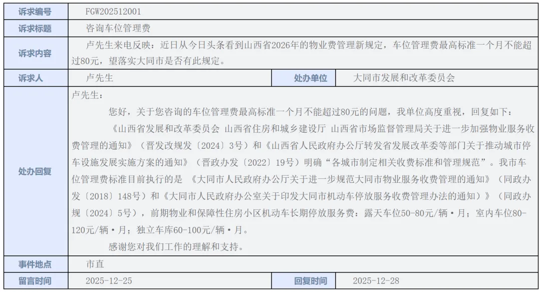 >大同市小区车位管理费标准