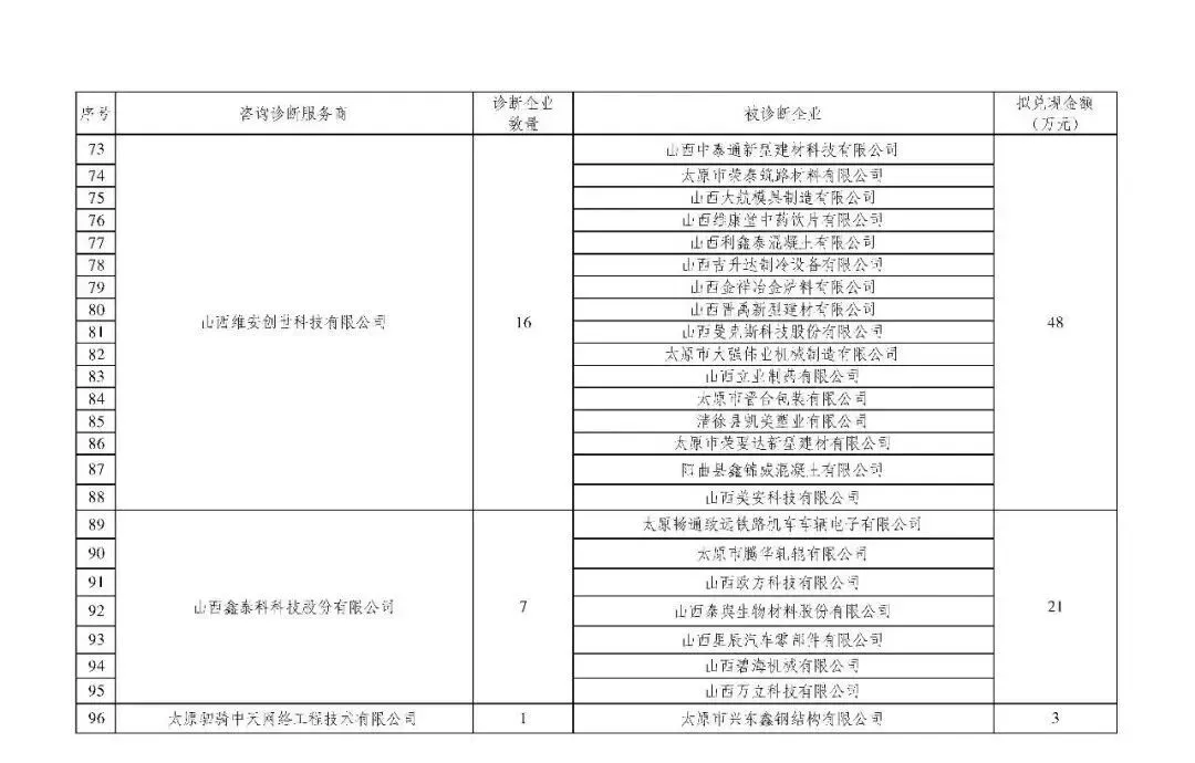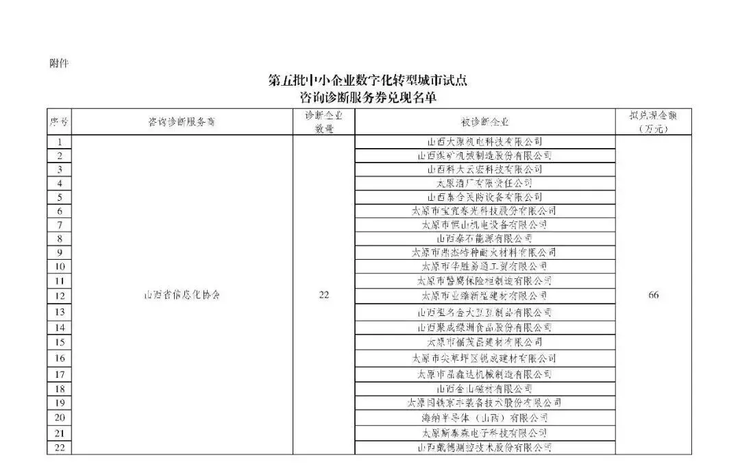 根据《中小企业数字化转型专项资金使用管理暂行办法》《太原市中小企业数字化转型城市试点咨询诊断工作实施方案》和《关于组织开展太原市中小企业数字化转型城市试点咨询诊断券兑换工作的通知》有关要求,市工信局组织开展了咨询诊断服务券兑换工作,经县区推荐、专家评审、会议研究等程序,现将第五批中小企业数字化转型城市试点咨询诊断服务券兑现名单予以公示(详见附件),如有异议,请在公示期内以书面形式反馈我局,并提供必要的佐证材料。