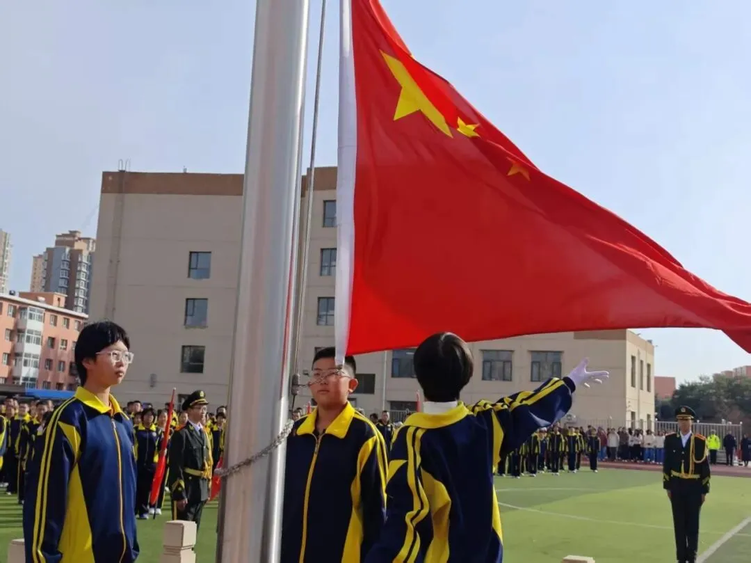 大会在庄严的国歌声中拉开帷幕,全体师生肃立致敬,面向国旗,行注目礼。