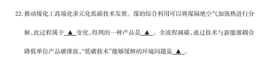 典型错误:写成了物理变化;主要产品写成“炭”“碳”;低碳技术缓解的环境问题写成“温室效应”、“气候变暖”。