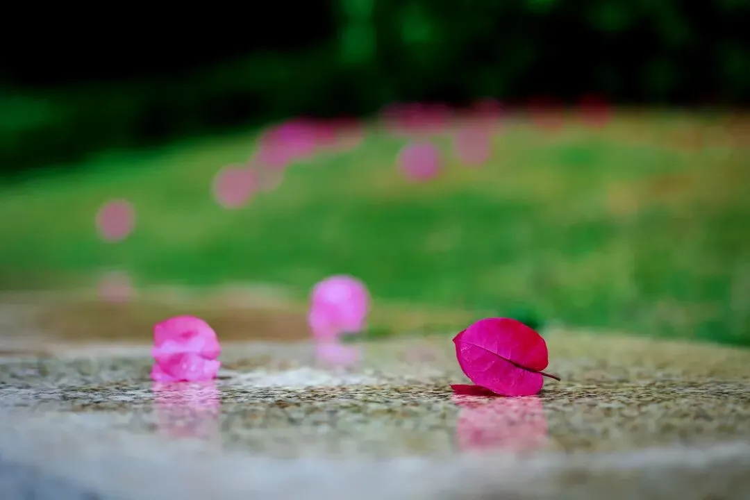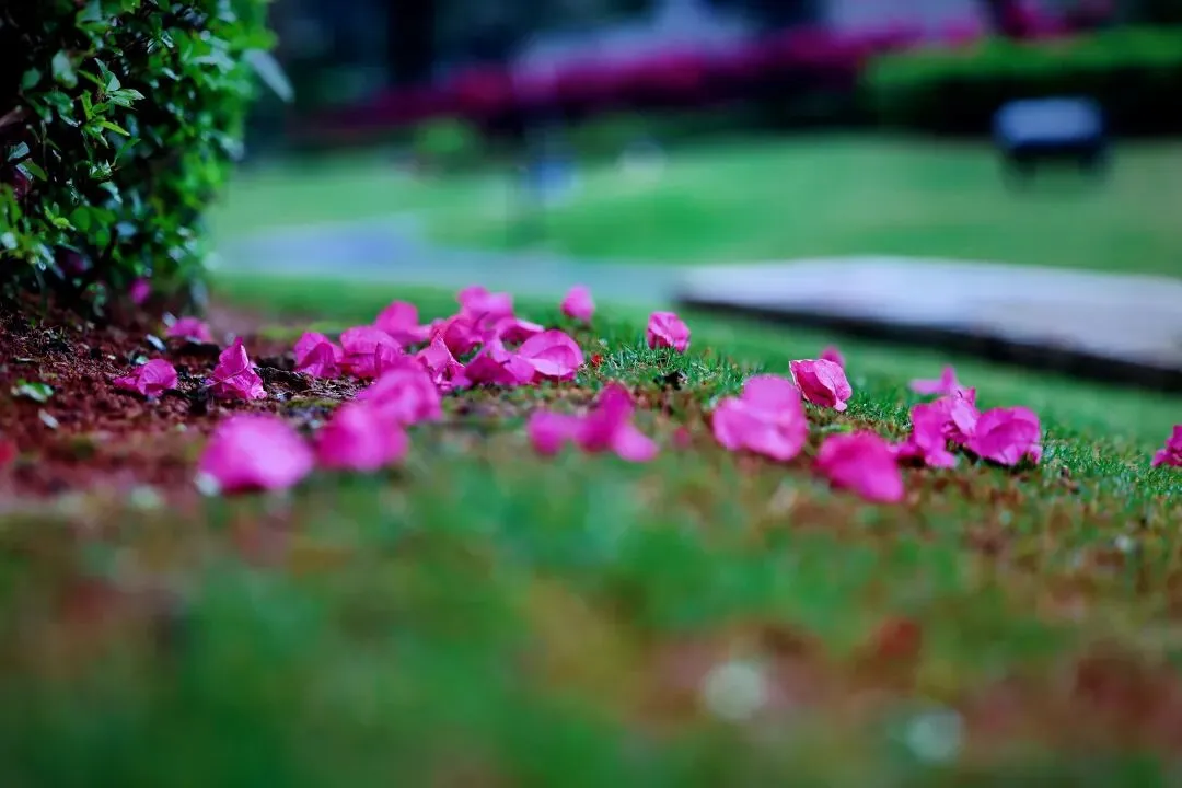 昨夜下过雨,地上散着些花瓣。粉的、紫的、红的,都安静地躺在泥土上,湿漉漉的,像是哭过了,又像是笑过了。