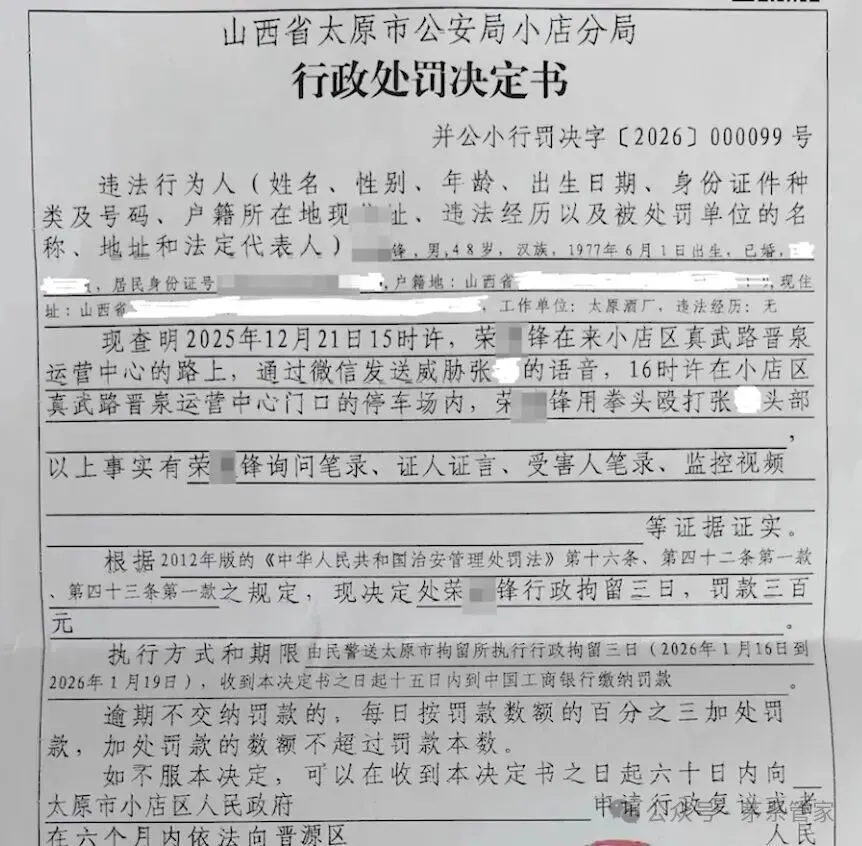 2026年1月16日,因伤情属轻微伤且无持械等情节,警方依据《治安管理处罚法》对荣某锋处以行政拘留3日、罚款300元。