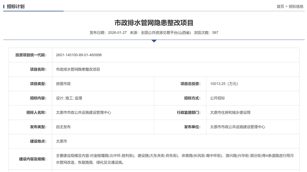 1月27日,官方发布了太原市政排水管网隐患整改项目的招标计划。