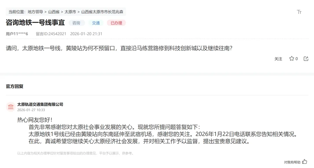 太原轨道交通集团有限公司在答复中确认,地铁1号线的规划建设已由黄陵站向东南方向延伸,直达武宿机场,这构成了当前线路的最终走向。