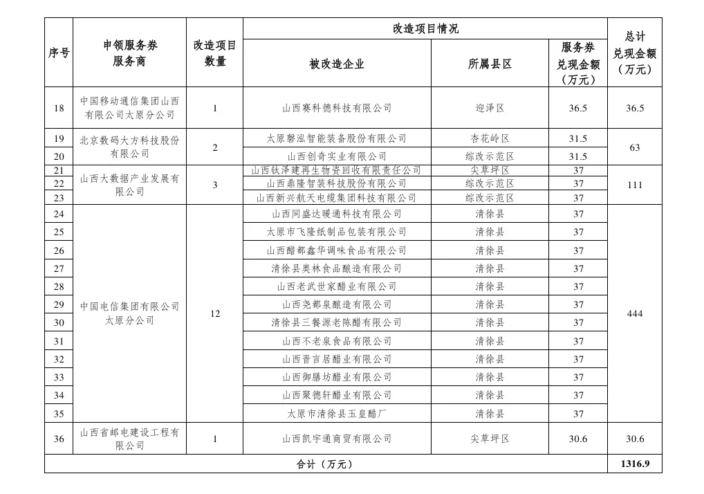 根据《中小企业数字化转型专项资金使用管理暂行办法》《关于印发〈太原市中小企业数字化转型“小快轻准”产品服务包推广应用实施细则〉的通知》《关于组织开展中小企业数字化转型产品服务包服务券兑换工作的通知》有关要求,我局组织开展了第四批中小企业数字化转型产品服务包服务券兑换工作,经第三方机构评测验收、县区推荐上报、市级评审、会议研究等程序,现将第四批中小企业数字化转型产品服务包服务券兑现名单予以公示(详见附件),如有异议,请在公示期内以书面形式反馈我局,并提供必要的佐证材料。