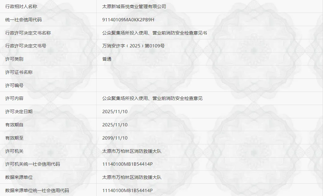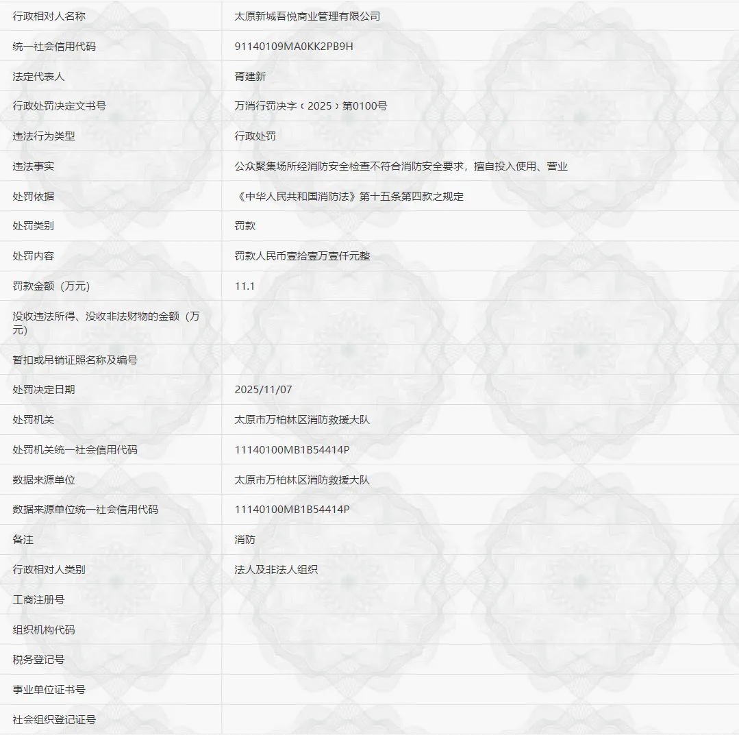 2025年11月7日,太原市万柏林区消防救援大队对太原吾悦广场进行处罚,罚款111000元,人民币壹拾壹万壹仟元整,违法事实:公众聚集场所经消防安全检查不符合消防安全要求,擅自投入使用、营业。2025年11月10日,太原新城吾悦商业管理有限公司新增行政许可,许可名称:公众聚集场所投入使用、营业前消防安全检查意见书,许可机关:太原市万柏林区消防救援大队,许可内容:公众聚集场所投入使用、营业前消防安全检查意见,有效期:2025-11-10至2099-11-10。行政处罚作为对消防安全违法行为的一种法律制裁,是维护消防安全秩序的重要手段,通过对违法行为者进行教育及处罚,促使单位和个人重视消防安全,警示人们遵守消防安全法律法规。2026年1月26日,太原新城吾悦商业管理有限公司再次被太原市万柏林区消防救援大队处罚,处罚金额32000元,违法事实:该单位外广场步行街设置多种经营点位占用防火间距。消防隐患为何越改越多、问题屡查屡犯?
