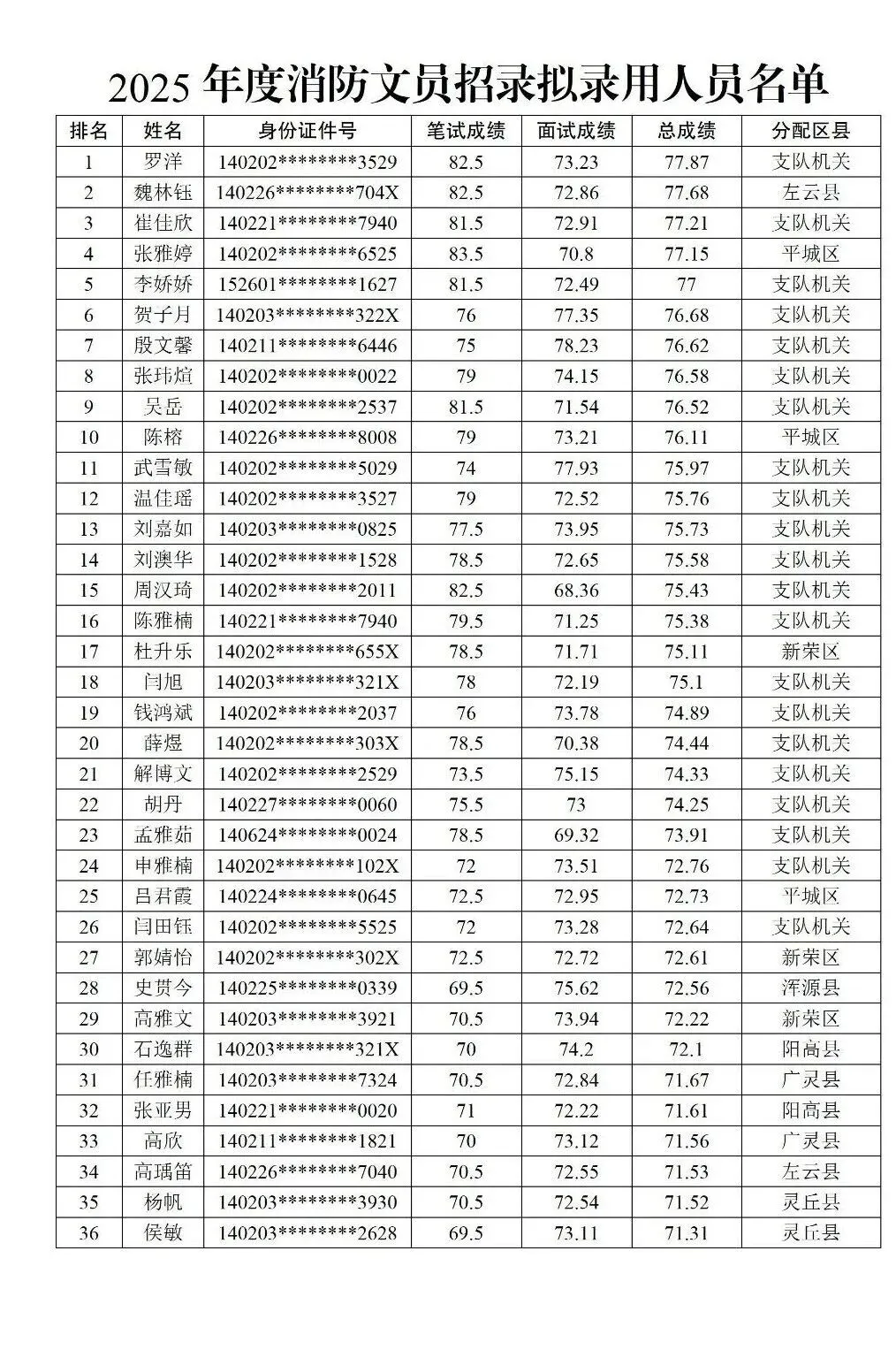依据《山西省专职消防队伍建设管理办法》(山西省人民政府第294号令)和山西省消防救援总队《政府专职消防员招录办法》等相关法规政策,按照《大同市消防救援支队关于面向社会公开招录2025年度政府专职消防员的公告》要求,大同市消防救援支队分阶段对消防文员招录对象进行了笔试、面试、心理测试、政治考核、体格检查五个环节考核,现对2025年度消防文员招录拟录用人员名单予以公示。