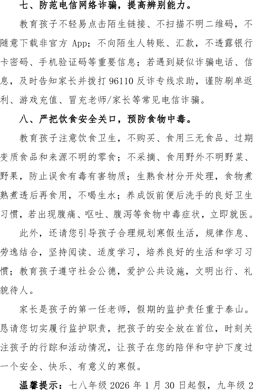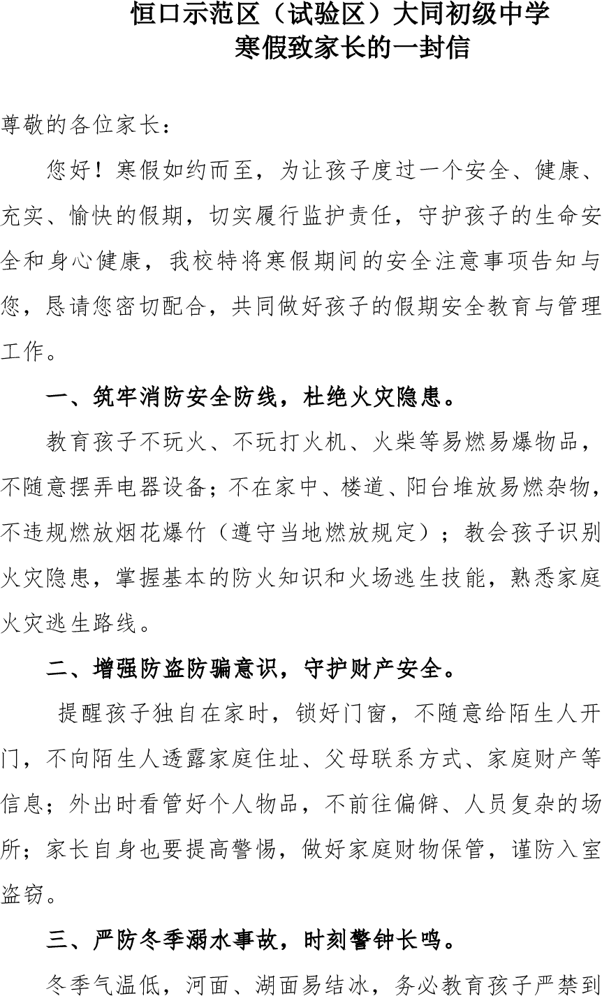 >恒口示范区(试验区)大同初级中学寒假致家长的一封信