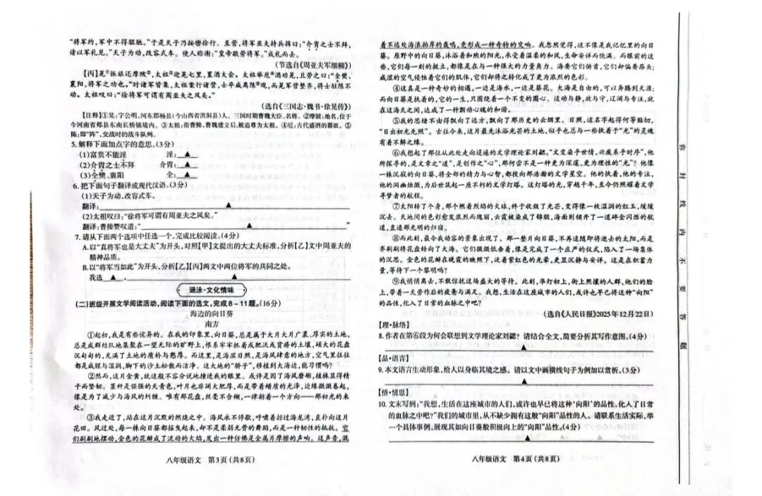 >太原市2025~2026年期末考试八年级语文试卷及答案