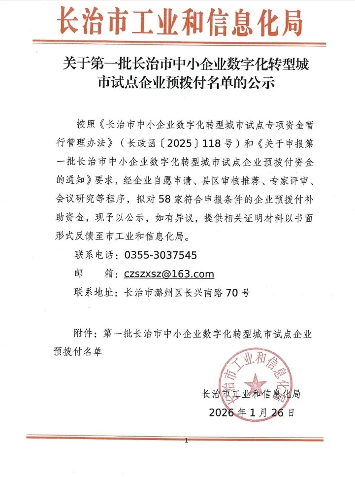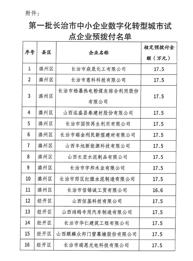 长治市工业和信息化局丨关于第一批长治市中小企业数字化转型城市试点企业预拨付名单的公示