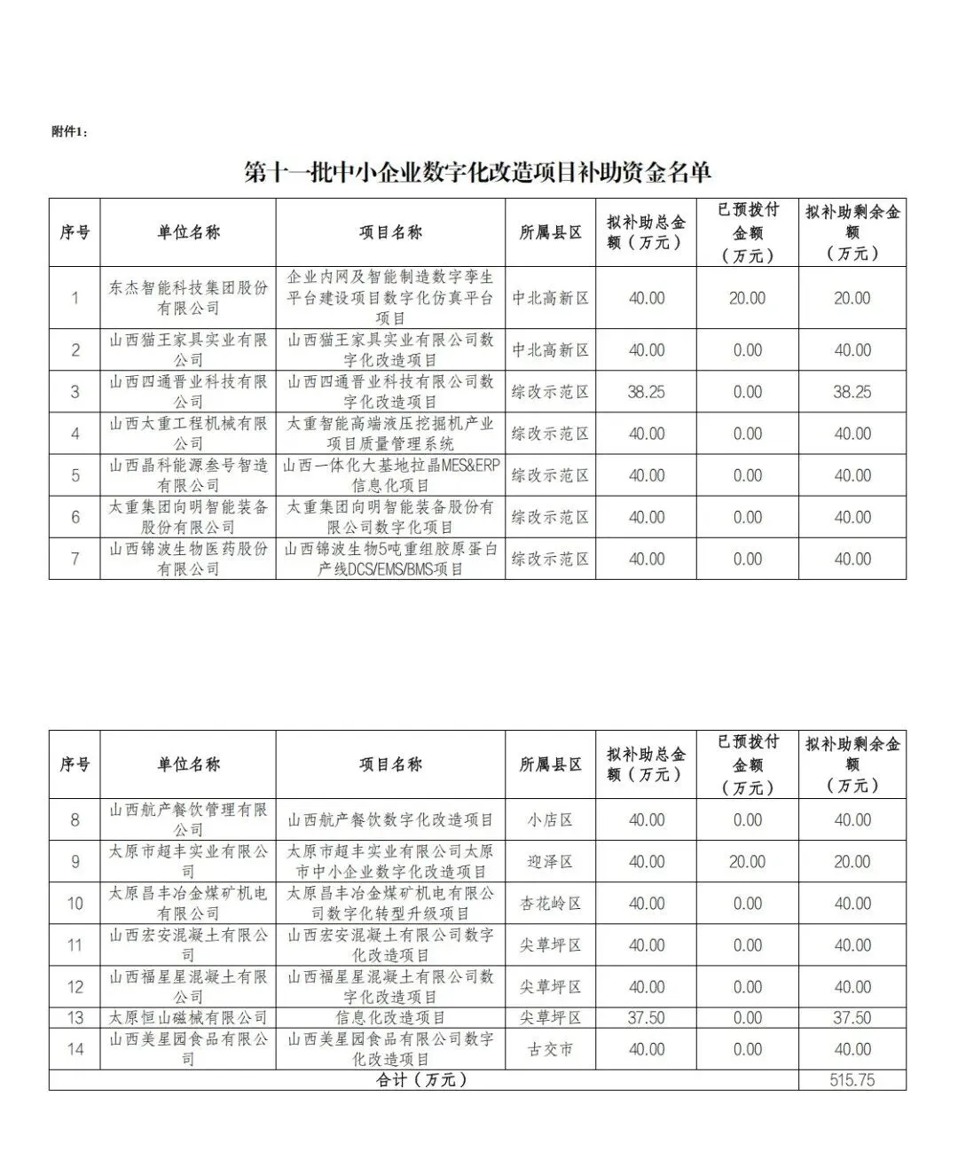 太原市工业和信息化局关于第十一批中小企业数字化改造项目补助资金拨付名单的公示