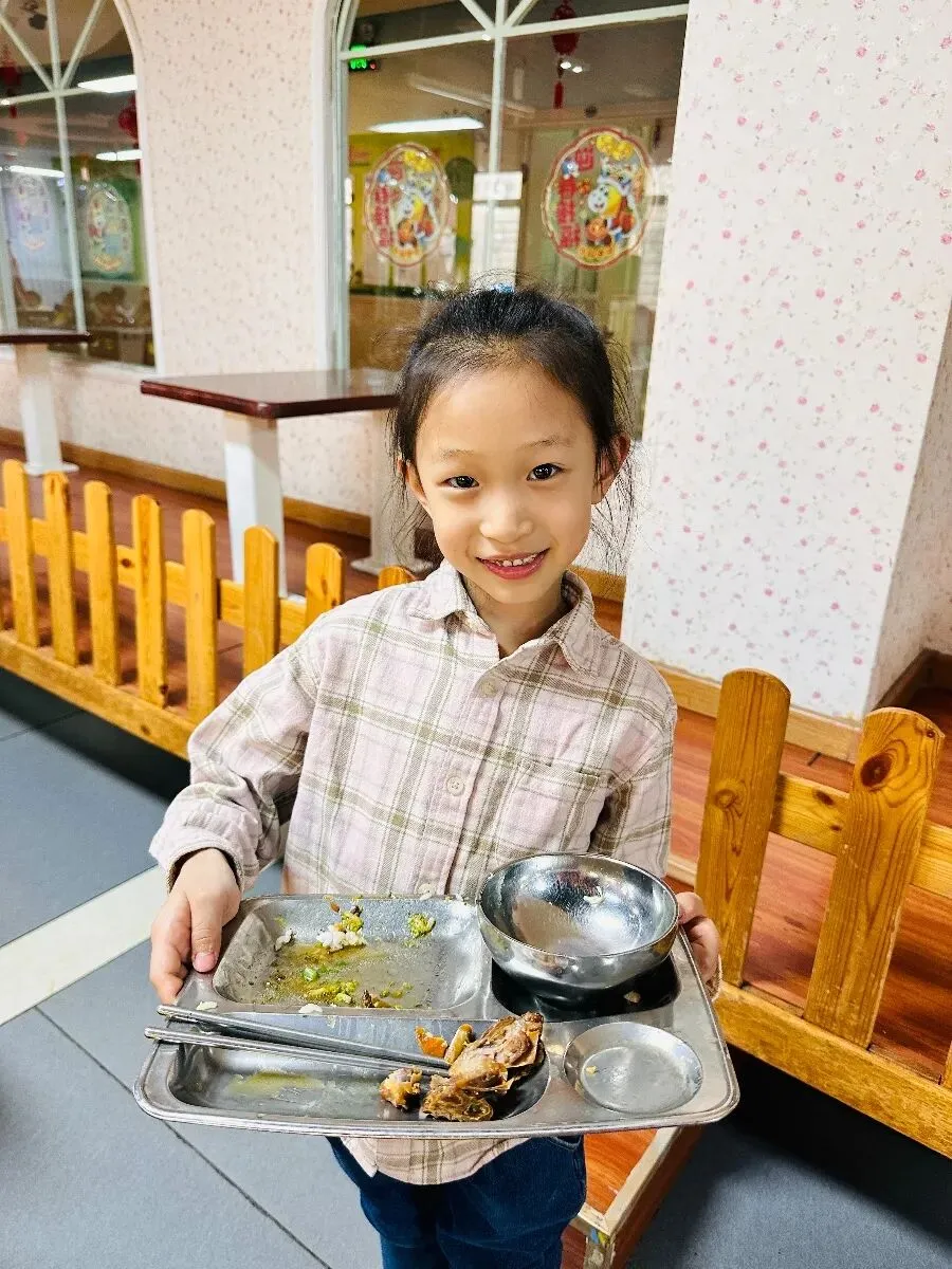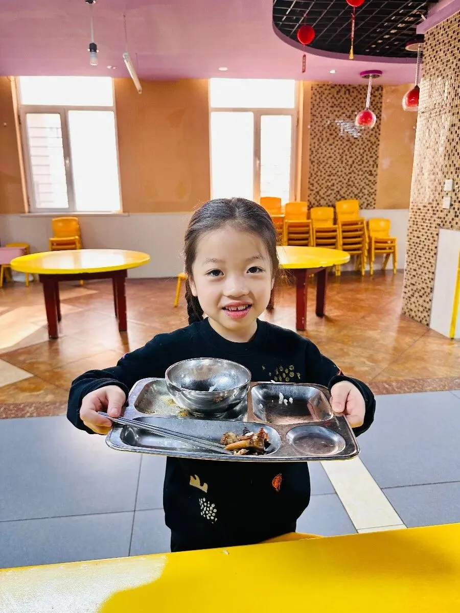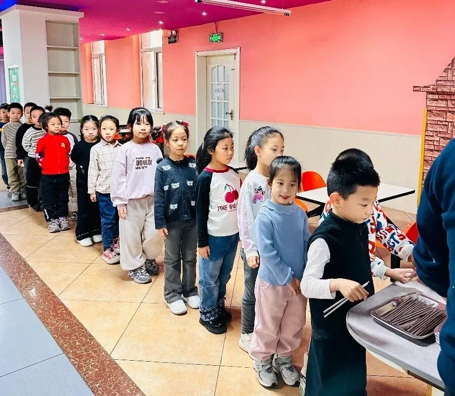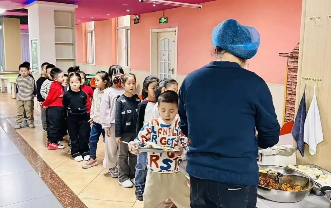 进入餐厅我们要排队打餐哦!这样我们可以自己的事情自己做,而且吃到自己端的餐也很香呢。
