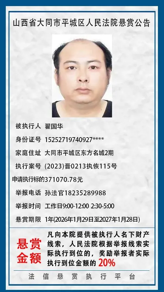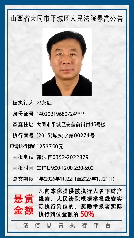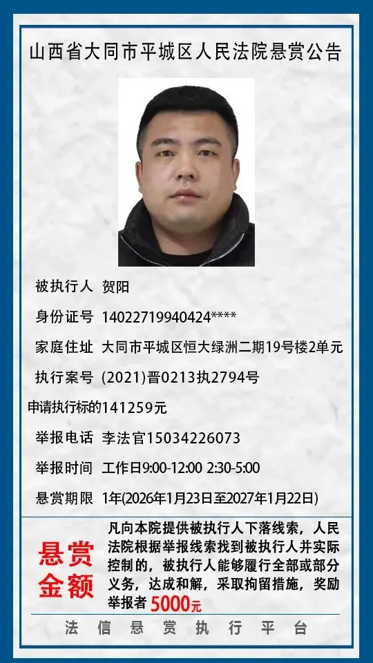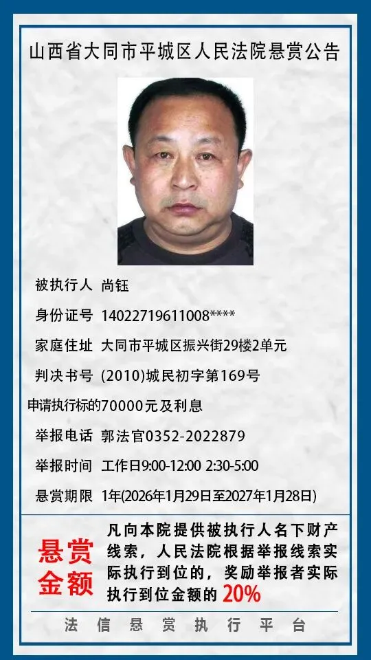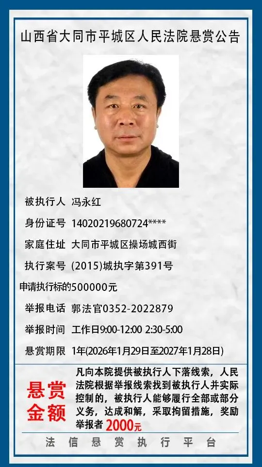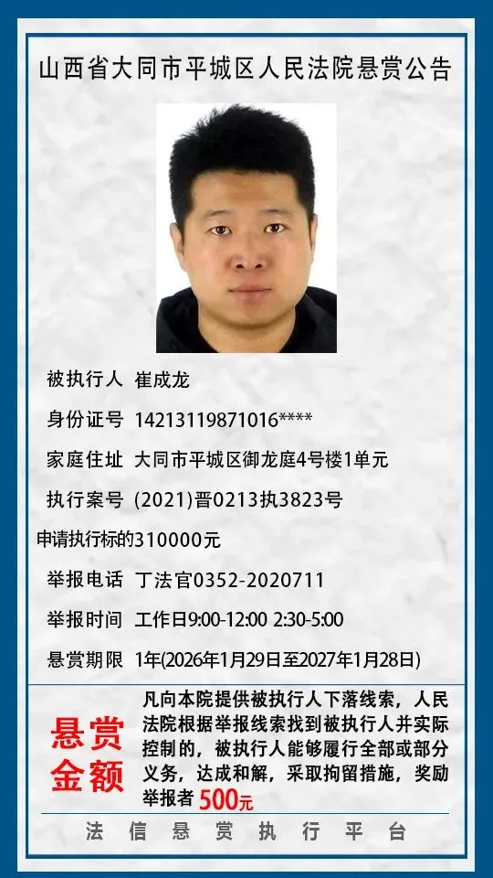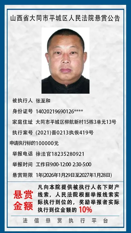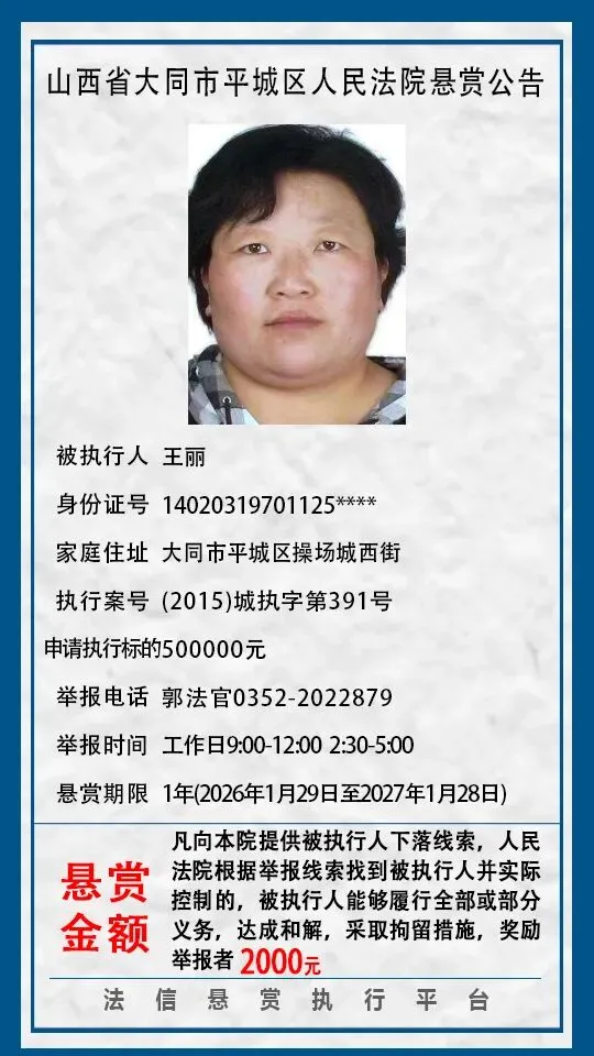 山西省大同平城区人民法院悬赏公告(2026年1月第二期)