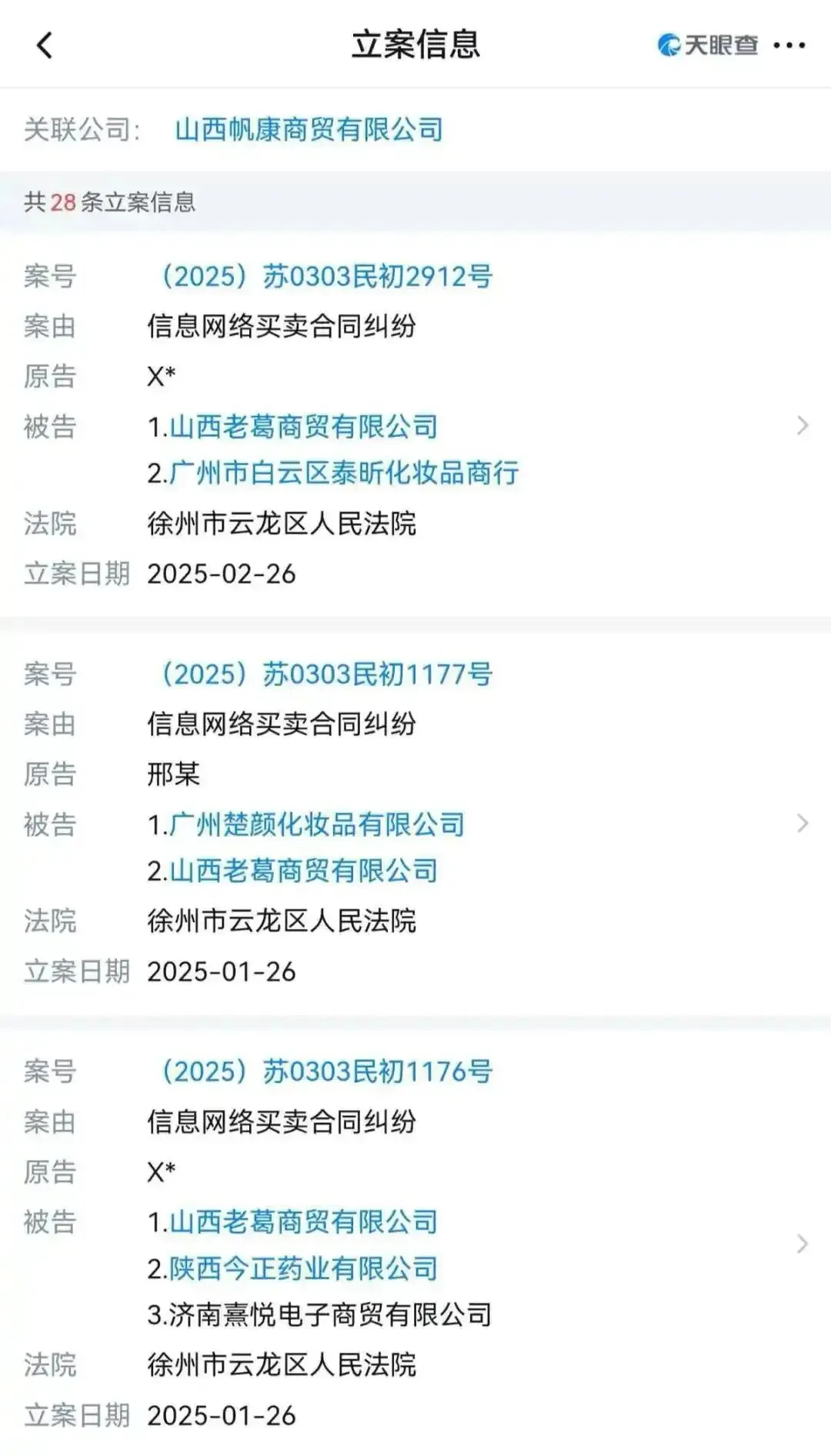 天眼查风险提示,该公司2024至2025年共有28条立案信息,被告案由基本上都是“信息网络买卖合同纠纷”,涉及全国多地。