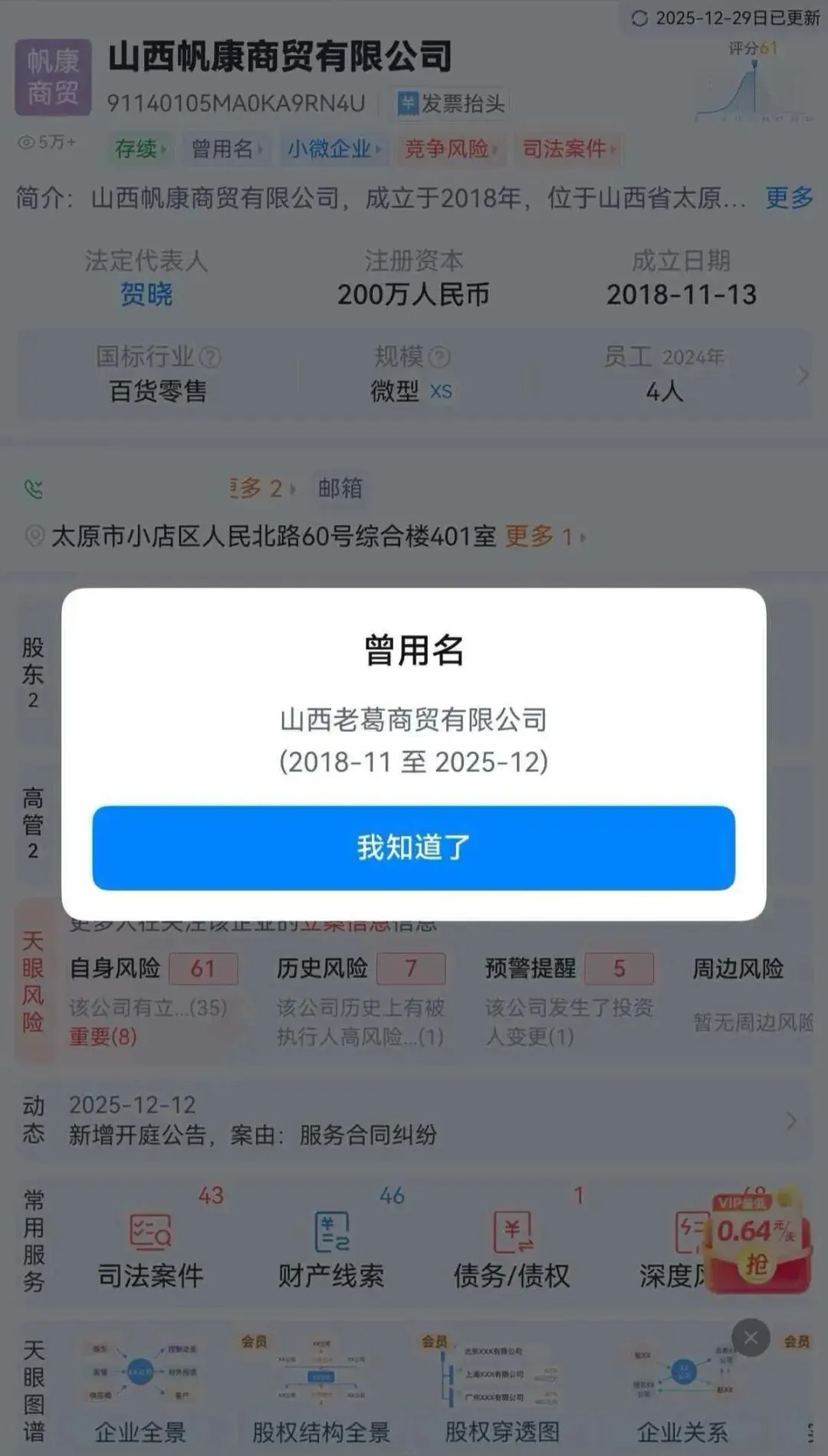 更值得注意的是,此次被处罚的核心主体——山西老葛商贸有限公司,早已在2025年12月上旬完成工商更名,变成了“山西帆康商贸有限公司”,距离其被市场监管总局列为典型案例仅一个多月,“换马甲”避责的意图十分明显。