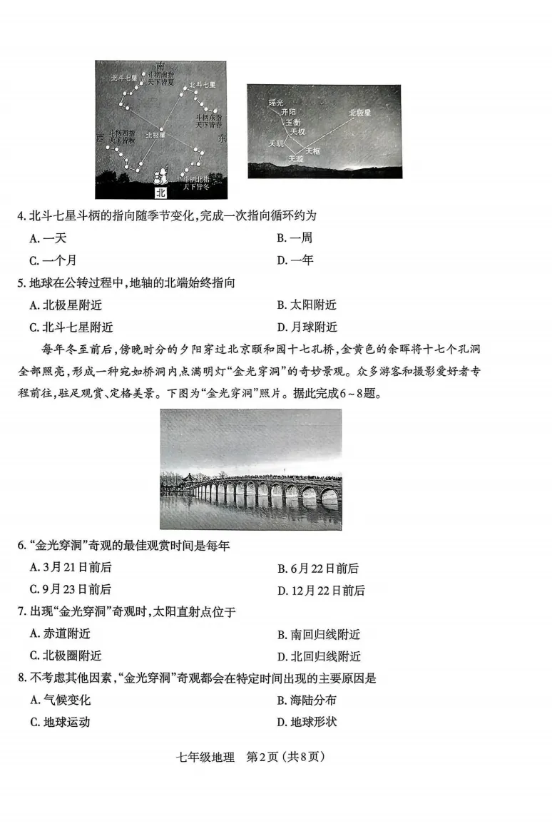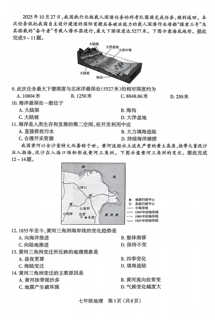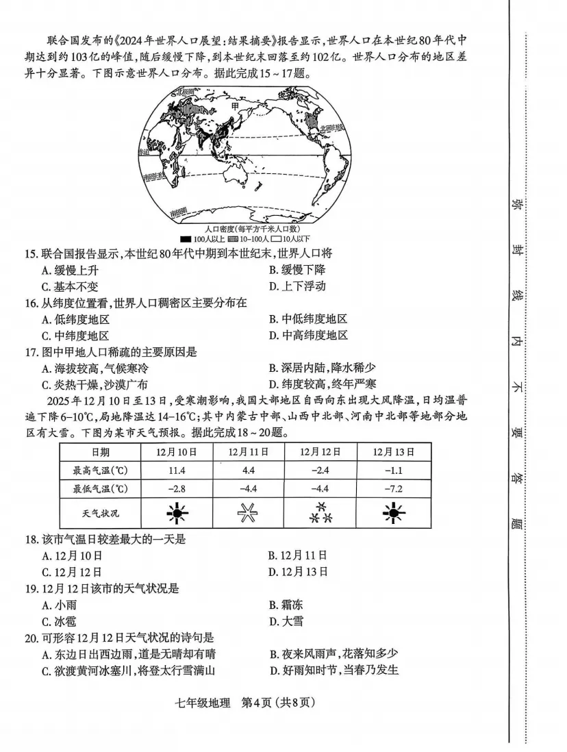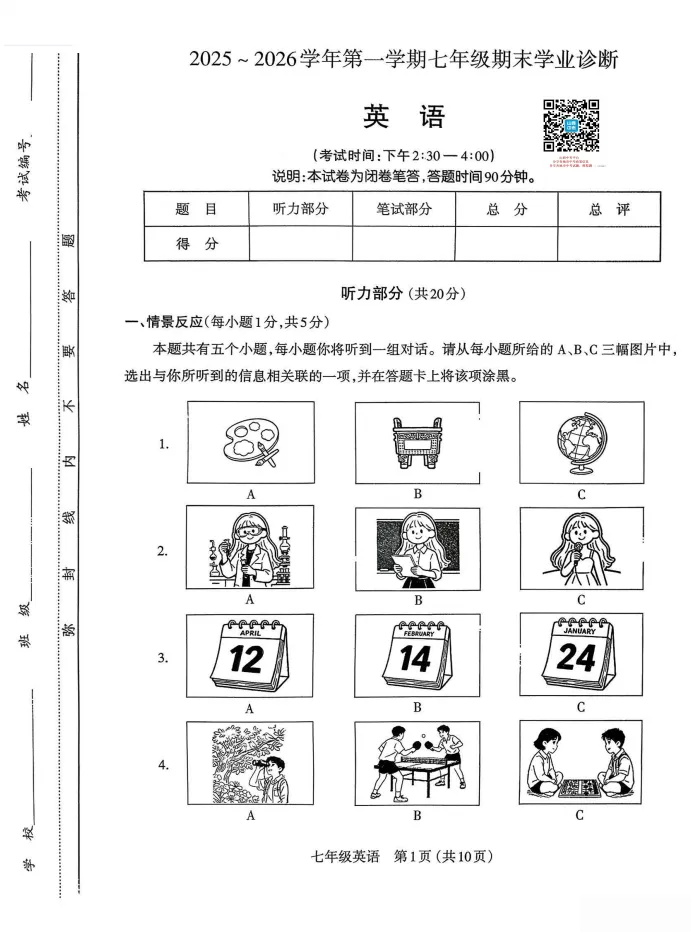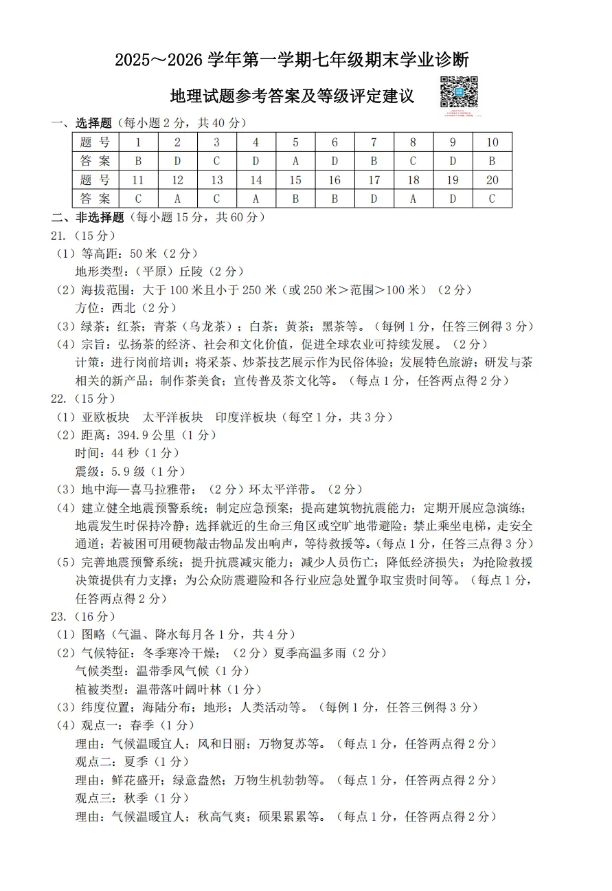 >太原市2025-2026学年第一学期七年级期末学业诊断语文、历史、英语、地理试题及答案