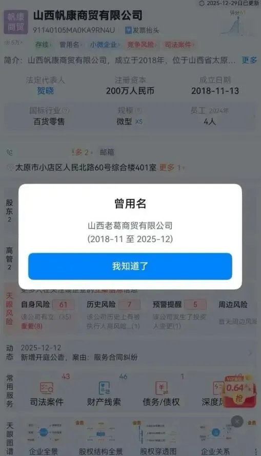 记者通过天眼查发现,其关联企业山西老葛商贸有限公司已于2025年12月上旬完成工商变更,更名为“山西帆康商贸有限公司”。记者拨打该公司电话,询问“太原老葛优选好物”账号是不是承德那家文化传媒公司的,对方称“不是”,随即反问“你要干啥呢?”记者表明身份欲进一步了解情况,对方挂断了电话。