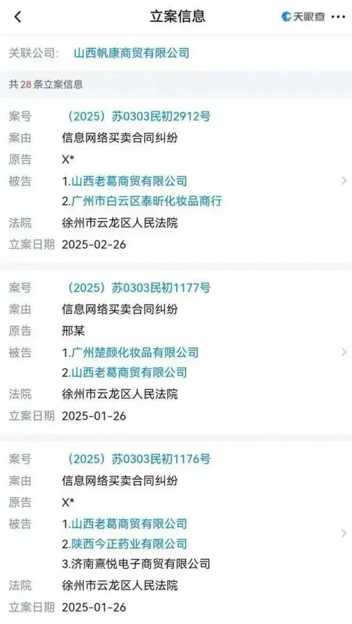 天眼查风险提示,该公司2024至2025年共有28条立案信息,被告案由基本上都是“信息网络买卖合同纠纷”,涉及全国多地。
