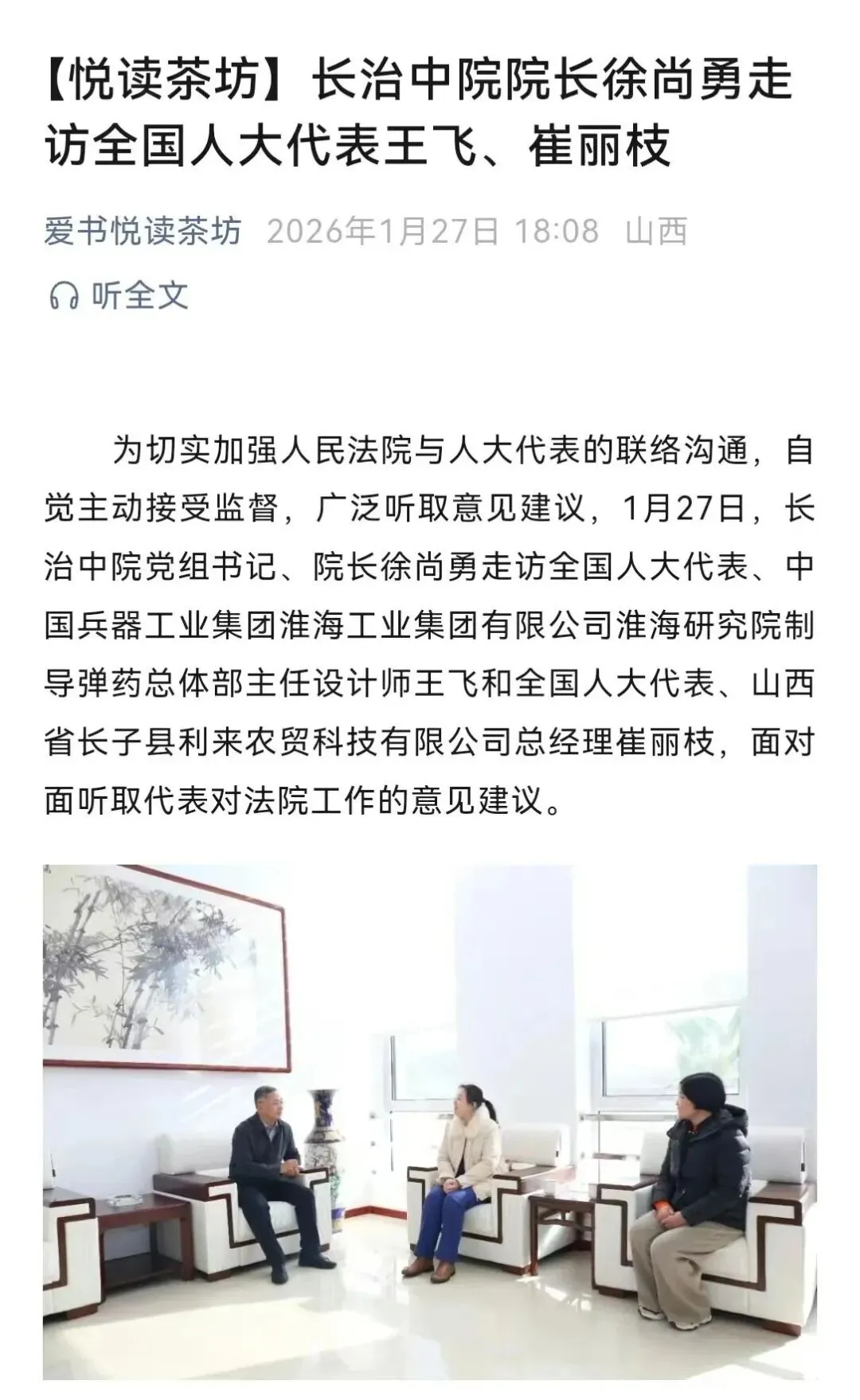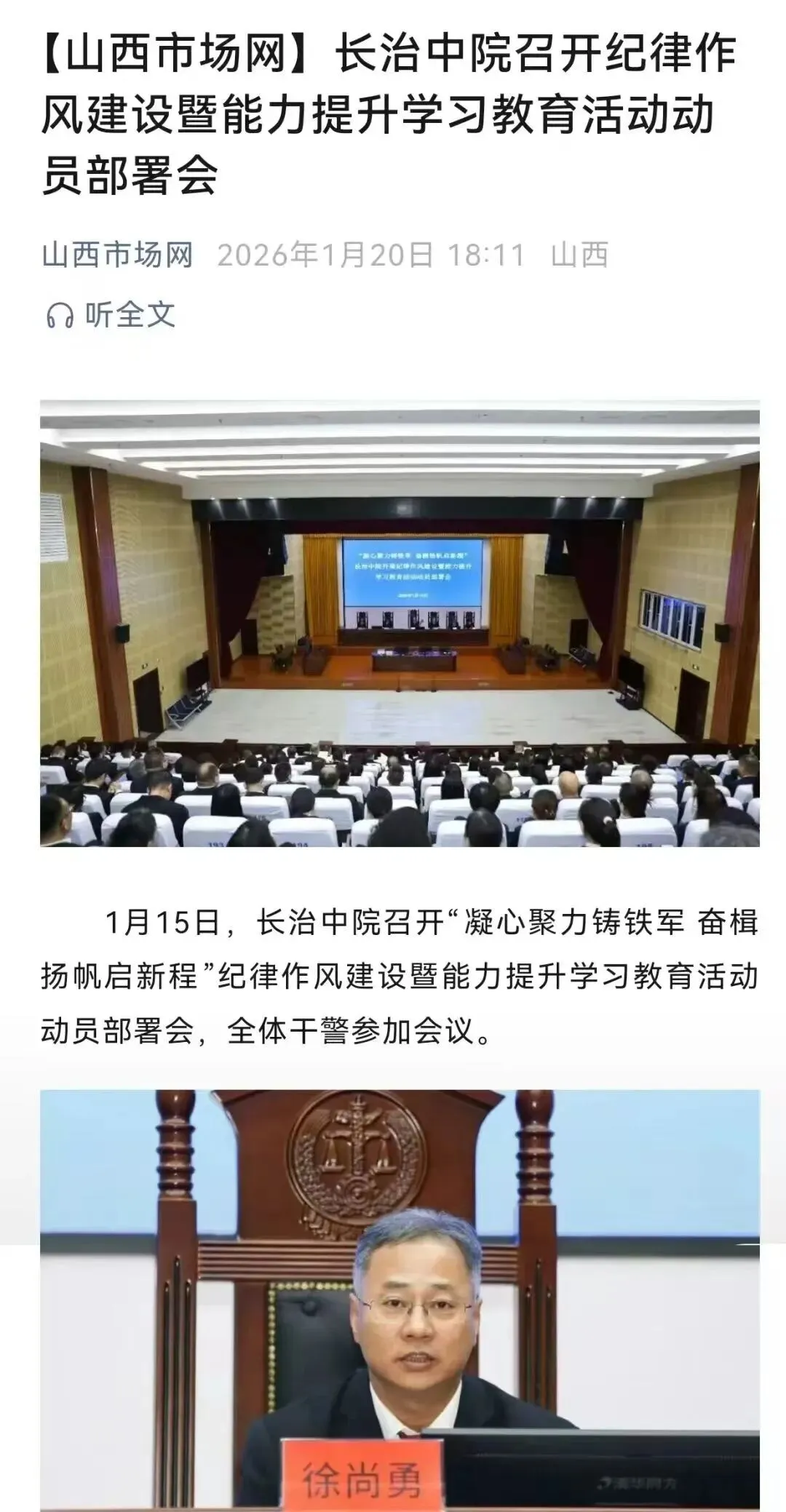 2026年1月28日,长治中院党组书记、院长徐尚勇一行深入沁源法院开展调研指导,并召开座谈会。沁源县委副书记、县长郭晓方,县委常委、县委办主任段彦飞,副县长、公安局局长骆兆保,县法院院长卫建红等陪同调研。