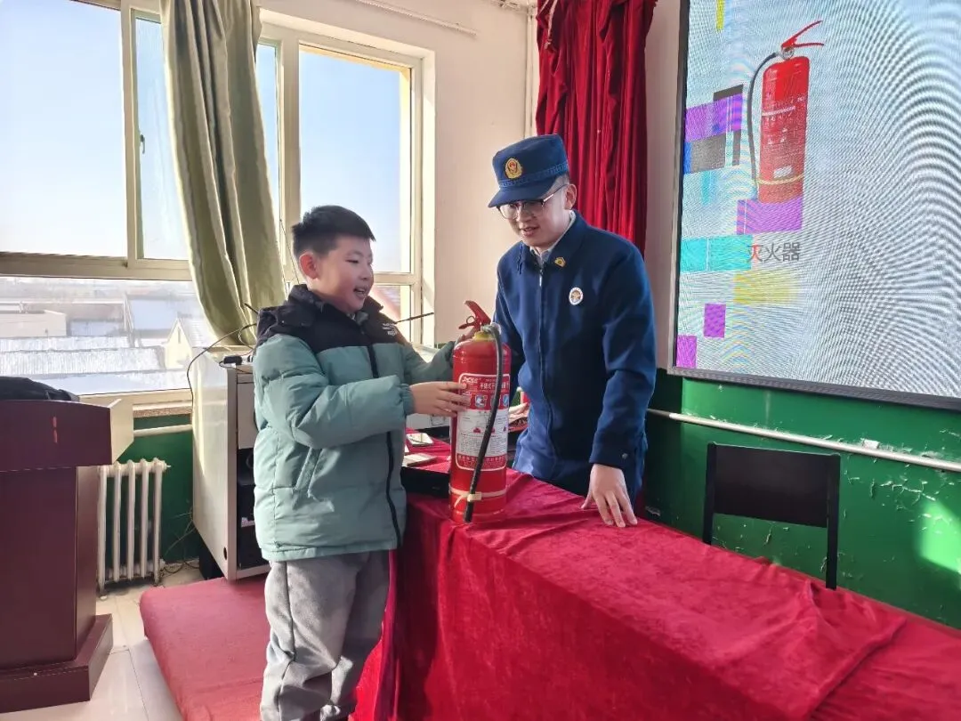 “同学们看,这个红色的小家伙是什么呀?”大屏幕上,一个可爱的卡通灭火器图像吸引了所有孩子的目光。当屏幕上出现各种消防标志时,孩子们纷纷举手抢答:“这是安全出口!”最吸引孩子们的是灭火器使用教学环节。宣讲员不仅详细讲解了“提、拔、握、压”四字使用口诀,还邀请几位同学上台进行模拟操作,趣味培训达到了预期效果。