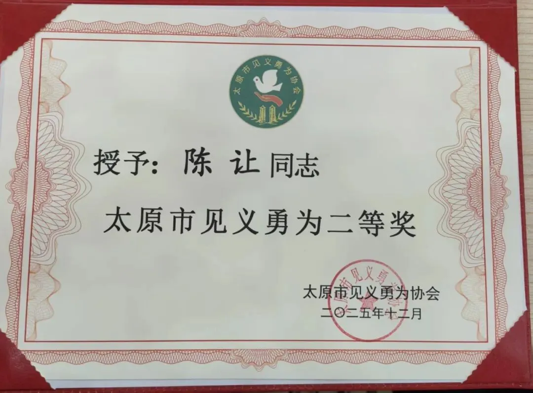 1月14日,太原市见义勇为协会对见义勇为先进个人进行褒奖,我省红十字救护员、山西工程职业学院大一学生陈让凭借关键时刻挺身而出、成功救助气道梗阻幼童的英勇事迹,荣获“太原市见义勇为先进个人”称号。