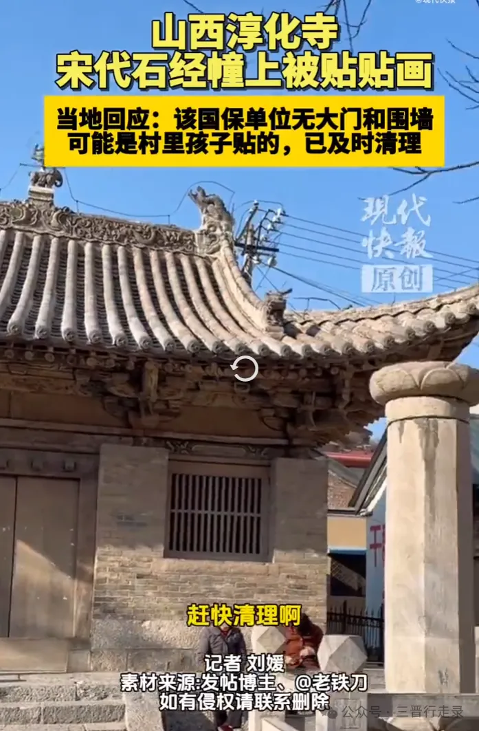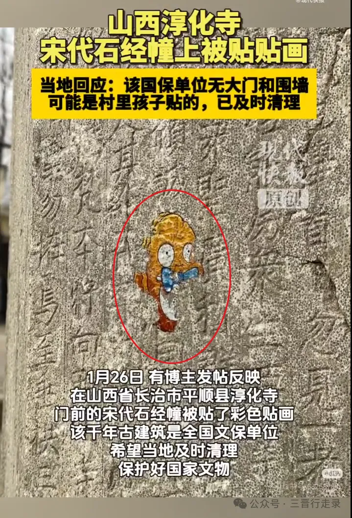 1月26日,有网友发帖称,在山西省长治市平顺县淳化寺门前的宋代石经幢被贴了彩色贴画,该千年古建筑是全国文保单位,希望当地及时清理,保护好文物。1月28日上午,