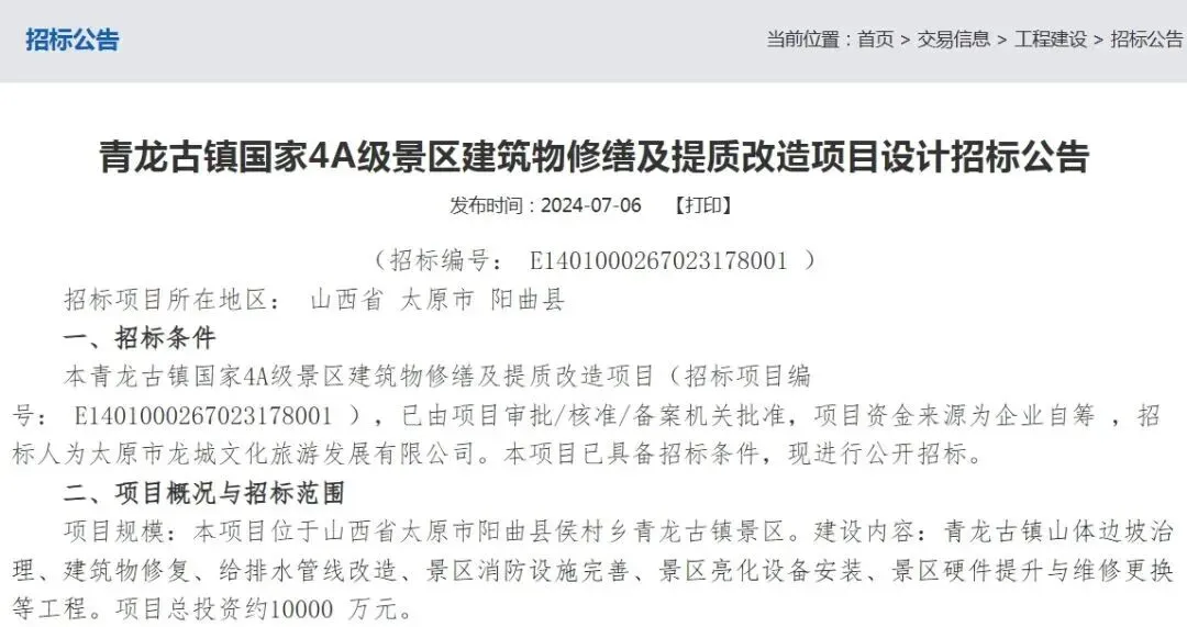 2024年7月6日,太原市公共资源交易中心发布《青龙古镇国家4A级景区建筑物修缮及提质改造项目设计招标公告》。公告显示,此次改造项目总投资约10000万元。建设内容涵盖了山体边坡治理、建筑物修复、给排水管线改造、消防设施完善以及景区亮化设备安装等。