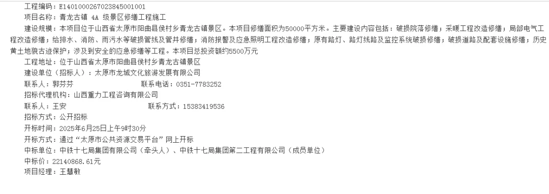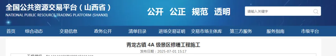 2025年7月1日,太原市青龙古镇4A级景区修缮工程施工项目在全国公共资源交易平台发布。内容显示本项目总投资额约5500万元。