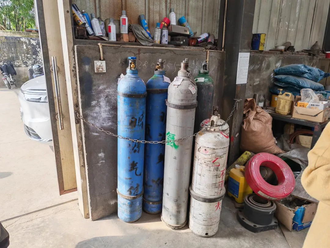 问题隐患1:氧气瓶(助燃气体)与乙炔瓶(易燃气体)混放