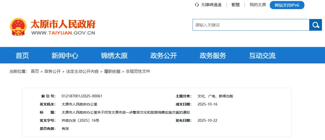 近日,太原市人民政府办公室印发《太原市进一步繁荣文化和旅游消费实施方案》(并政办发〔2025〕16号),紧扣“培育新增长点、满足民生需求、推动高质量发展”核心目标,从提升消费体验、丰富产品供给、打造消费场景、深化产业融合、优化消费环境五大维度推出20项具体举措,推动文旅产业向“支柱产业+民生产业+幸福产业”升级,为“锦绣太原城”文旅发展注入新动能。