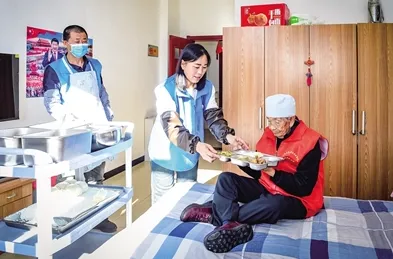 图为护工为行动不便的老人送来午饭。