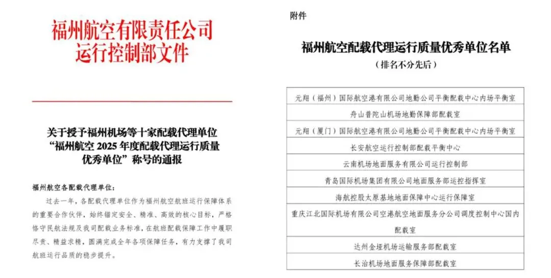 近日,福州航空向长治机场地面服务保障部授予“2025年度配载代理运行质量优秀单位”荣誉称号,表彰其在配载代理运行、安全保障与协同协作等方面的突出表现。这份沉甸甸的荣誉,不仅是对长治机场地服部配载团队专业能力与责任担当的高度肯定,更是对双方深度协作、共赢发展成果的生动见证。