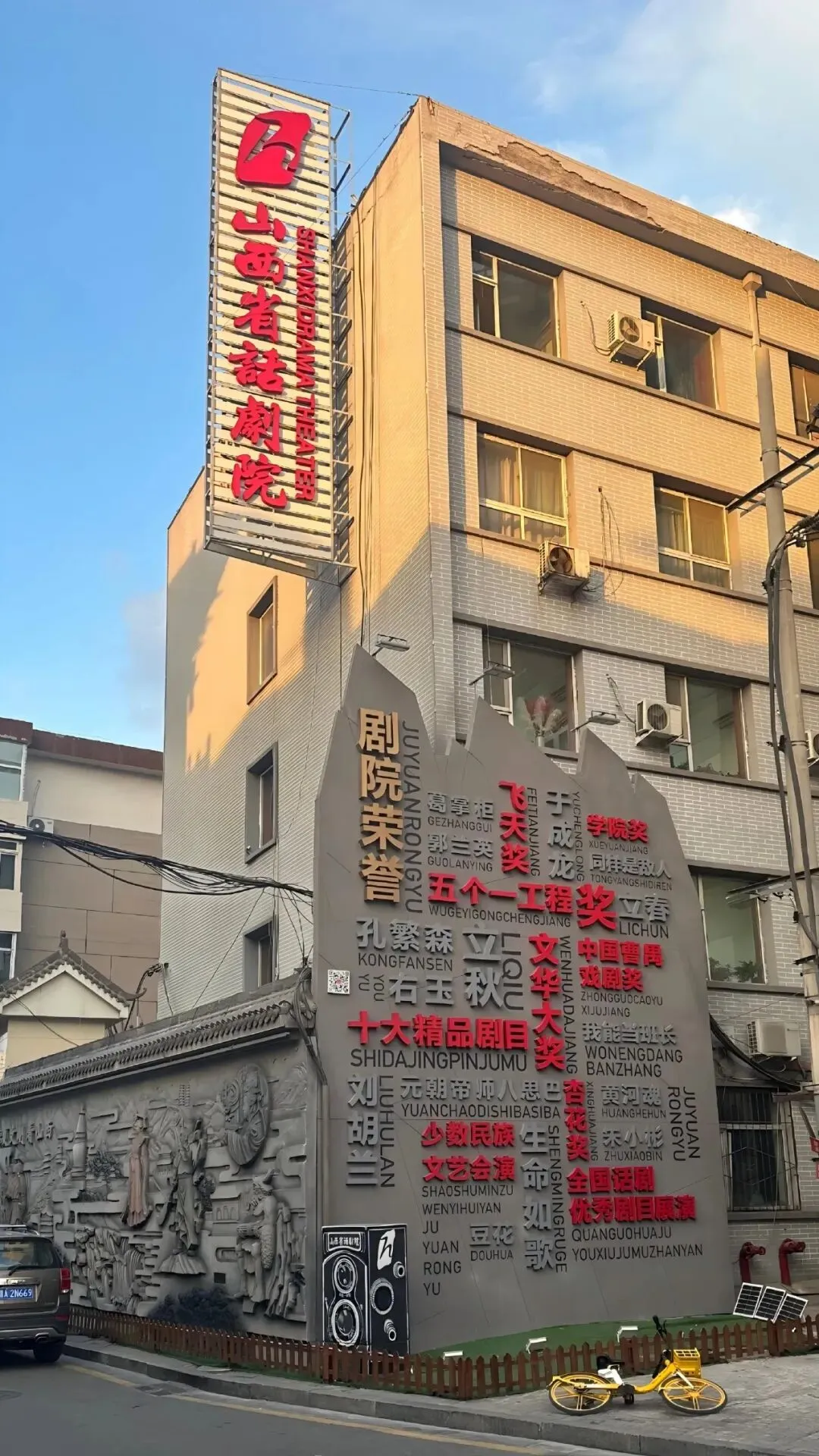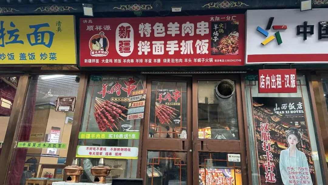 如果你放慢脚步,还会发现更多细节。比如山西省话剧院外立面上的“剧院荣誉”文化墙,记录着“五个一工程奖”“文华大奖”等国家级荣誉;山西饭店右侧的汉服出租店,为想体验“汉服打卡古建”的游客提供了便利。