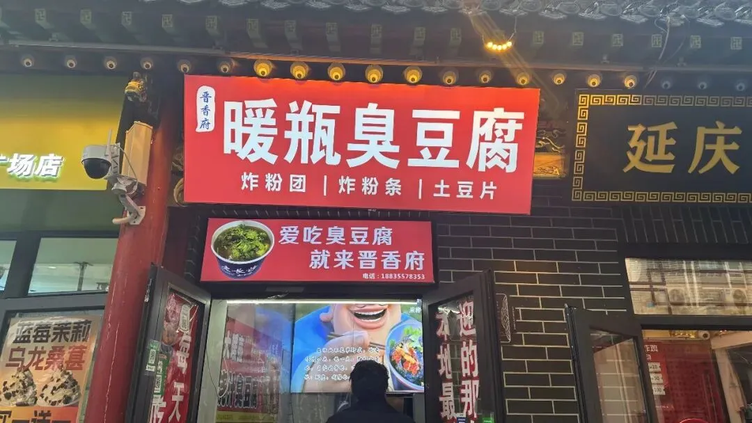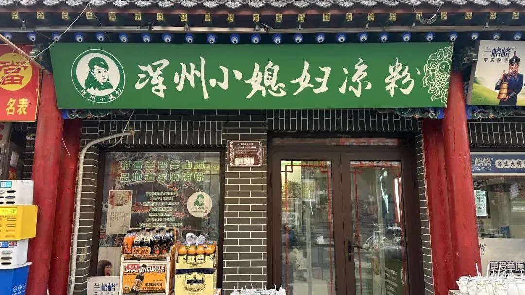 浑州小媳妇凉粉的门面是典型的黑砖红柱传统风格,门外陈列的陈醋等特产无声述说着“游晋善晋美山西,品地道浑源凉粉”的品牌故事。