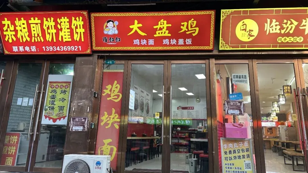 而几步之外的崔叔叔大盘鸡则以亲民的价格和家庭聚餐的友好氛围吸引着过往食客。