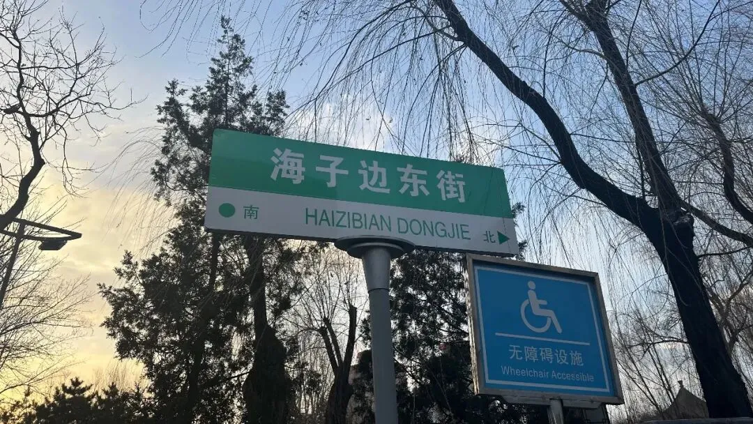 在街道尽头,一面刻有“海子边东街”的路牌静静矗立,从这里向西望去,文瀛公园的湖光树影若隐若现。
