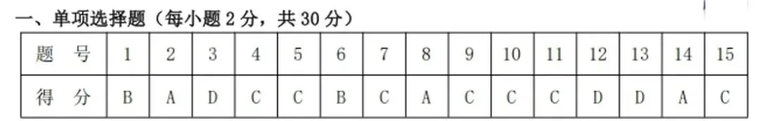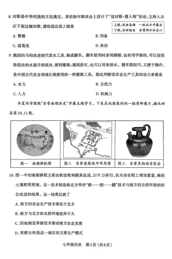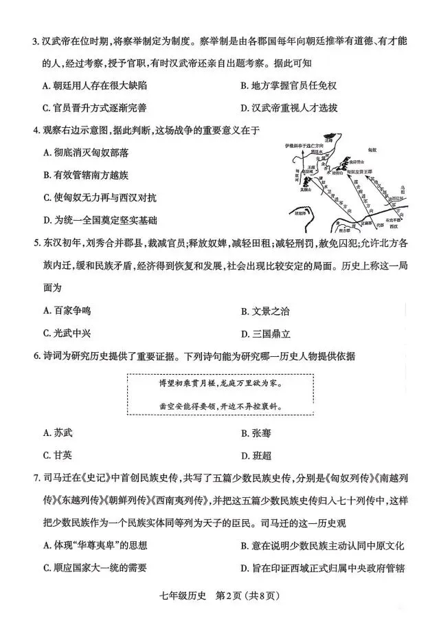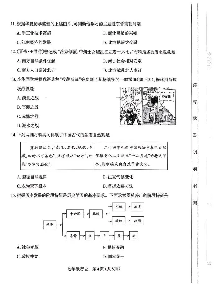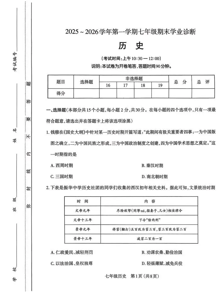 2025-2026学年第一学期七年级期末学业诊断历史参考答案及评分标准