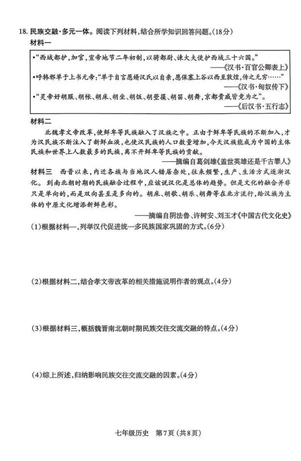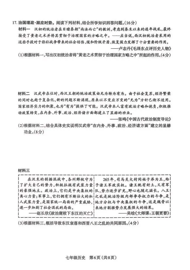 17.(1)西汉统治者吸取秦亡的教训,采取休养生息的政策,使西汉初期的经济从战乱中逐步恢复:国家局势稳定:弥补了战争带来的社会创伤,缓和阶级矛盾,为恢复国力发挥了重要作用。(任意一点得2分,共4分)