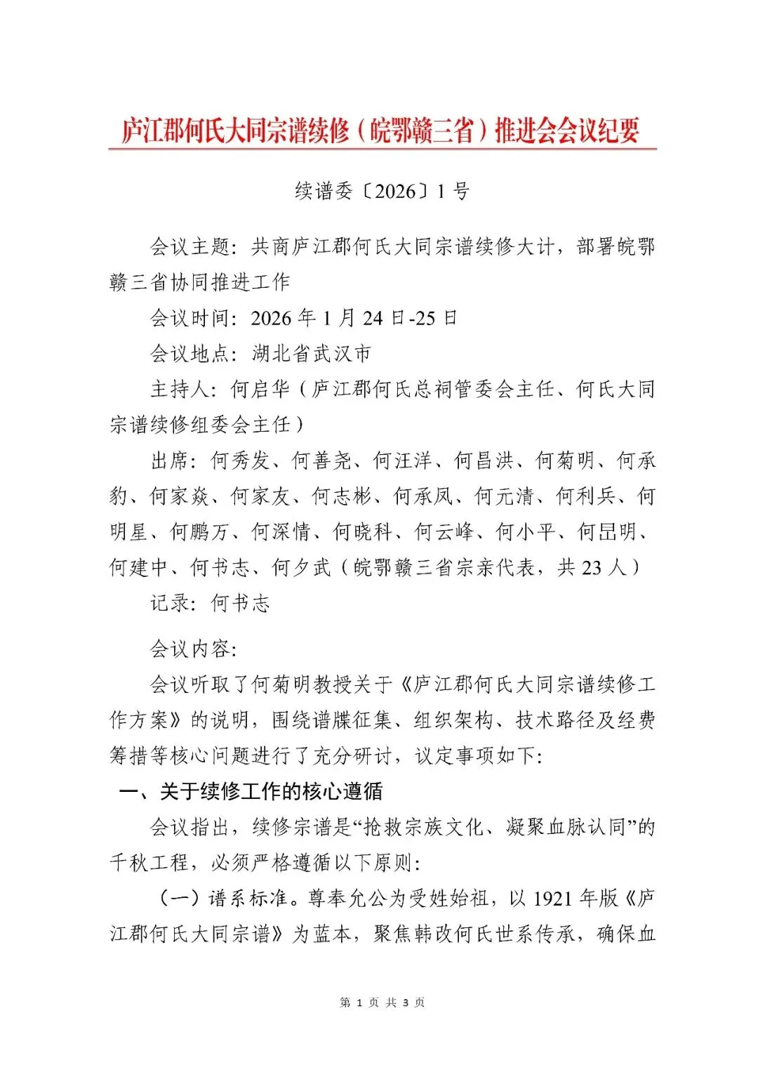 会议听取了何菊明教授关于《庐江郡何氏大同宗谱续修工作方案》的说明,围绕谱牒征集、组织架构、技术路径及经费筹措等核心问题进行了充分研讨,议定事项如下: