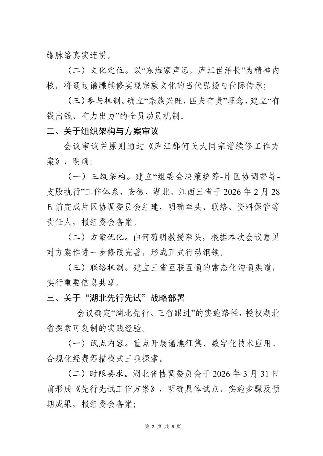 会议审议并原则通过《庐江郡何氏大同宗谱续修工作方案》,明确: