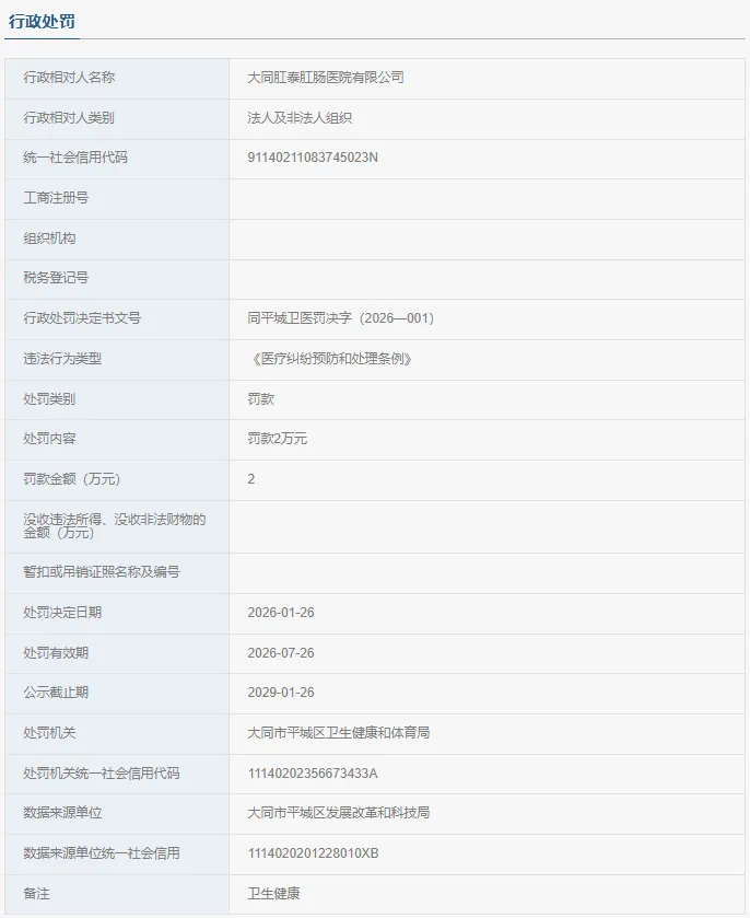 大同一家医院被罚!