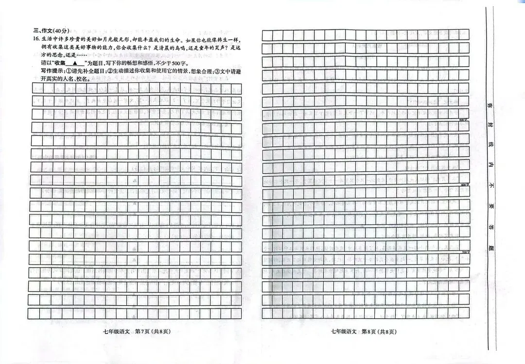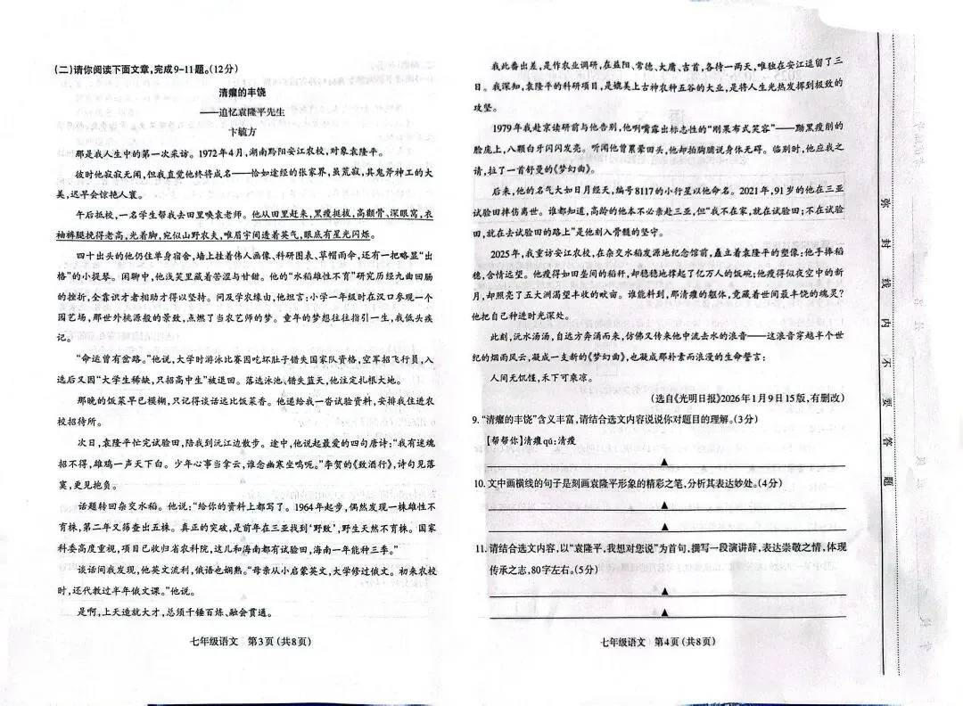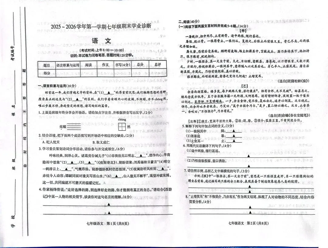 2025-2026学年第一学期七年级期末学业诊断语文试题参考答案及评分建议